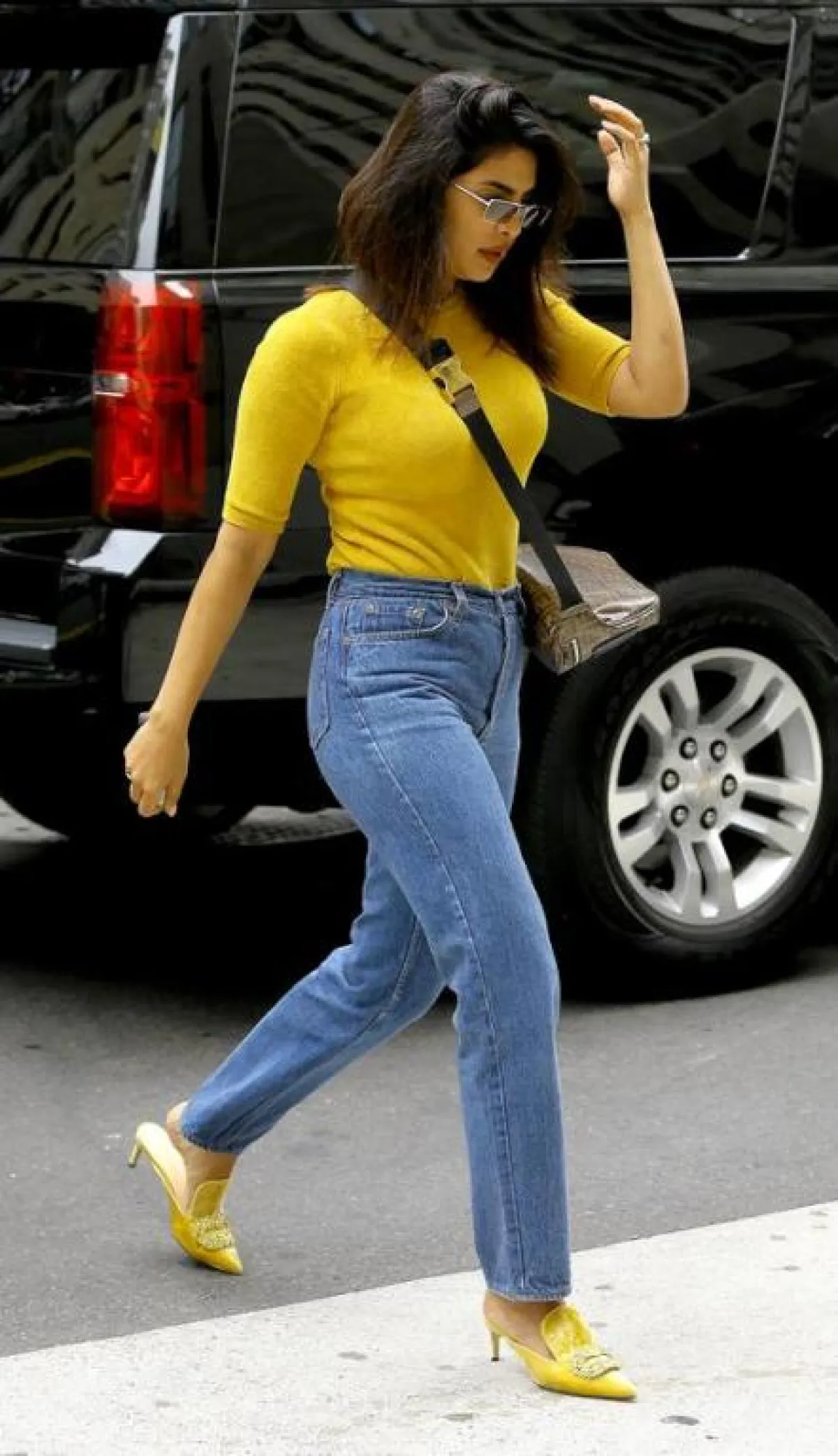 ذهبت نجمة بوليوود، بريانكا تشوبرا، الى جينز السبعينات، و نسقته توب محبوك باللون الأصفر الخردلي، وعززت إطلالتها الأنيقة بزوج من حذاء المول mule مزين بتطريز أمامي.