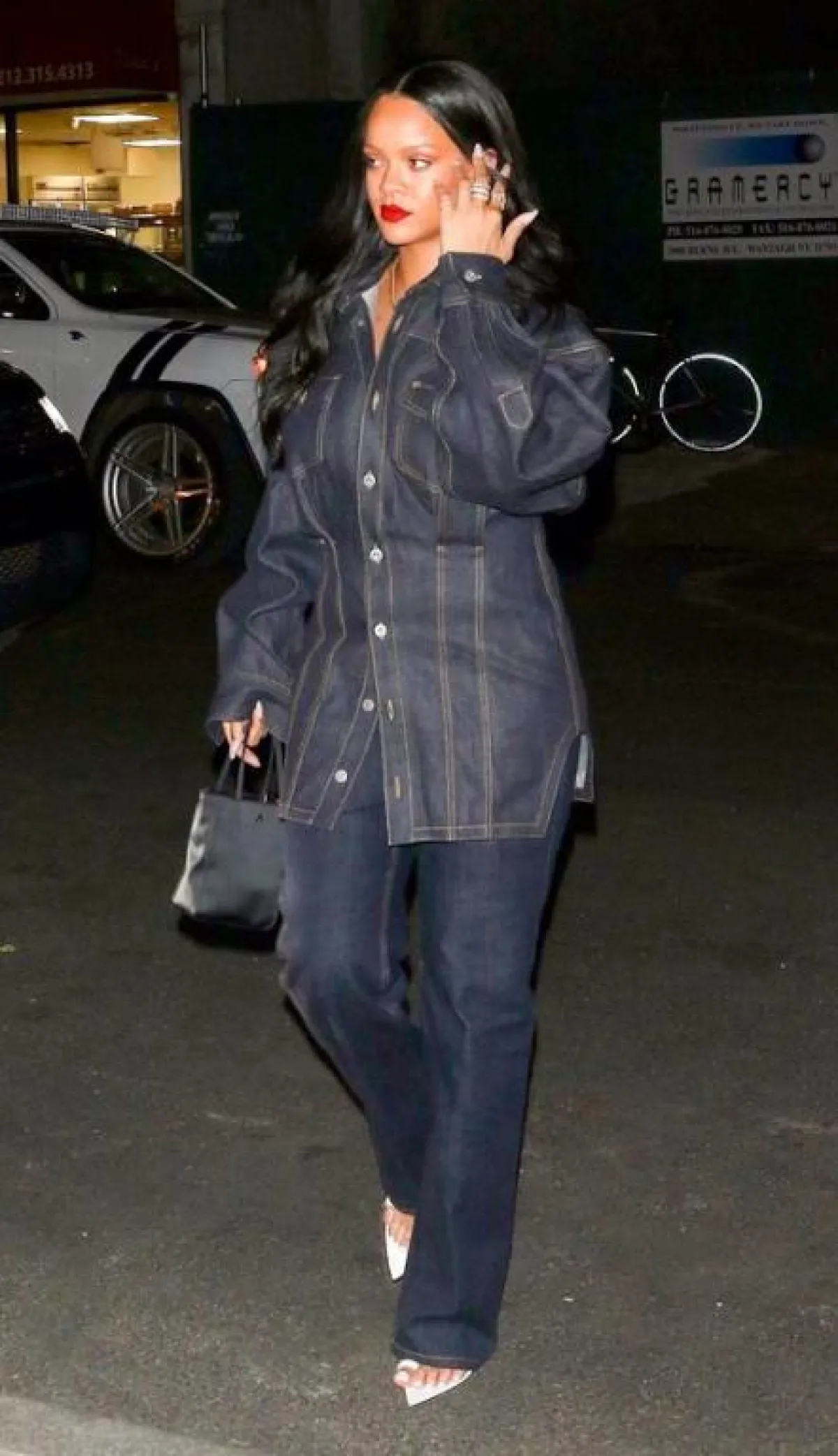 ظهرت النجمة ريهانا ببدلة جينز مصممة من جاكيت عصري مع الجينز المستقيم المتوقع رواجه خلال الخريف.