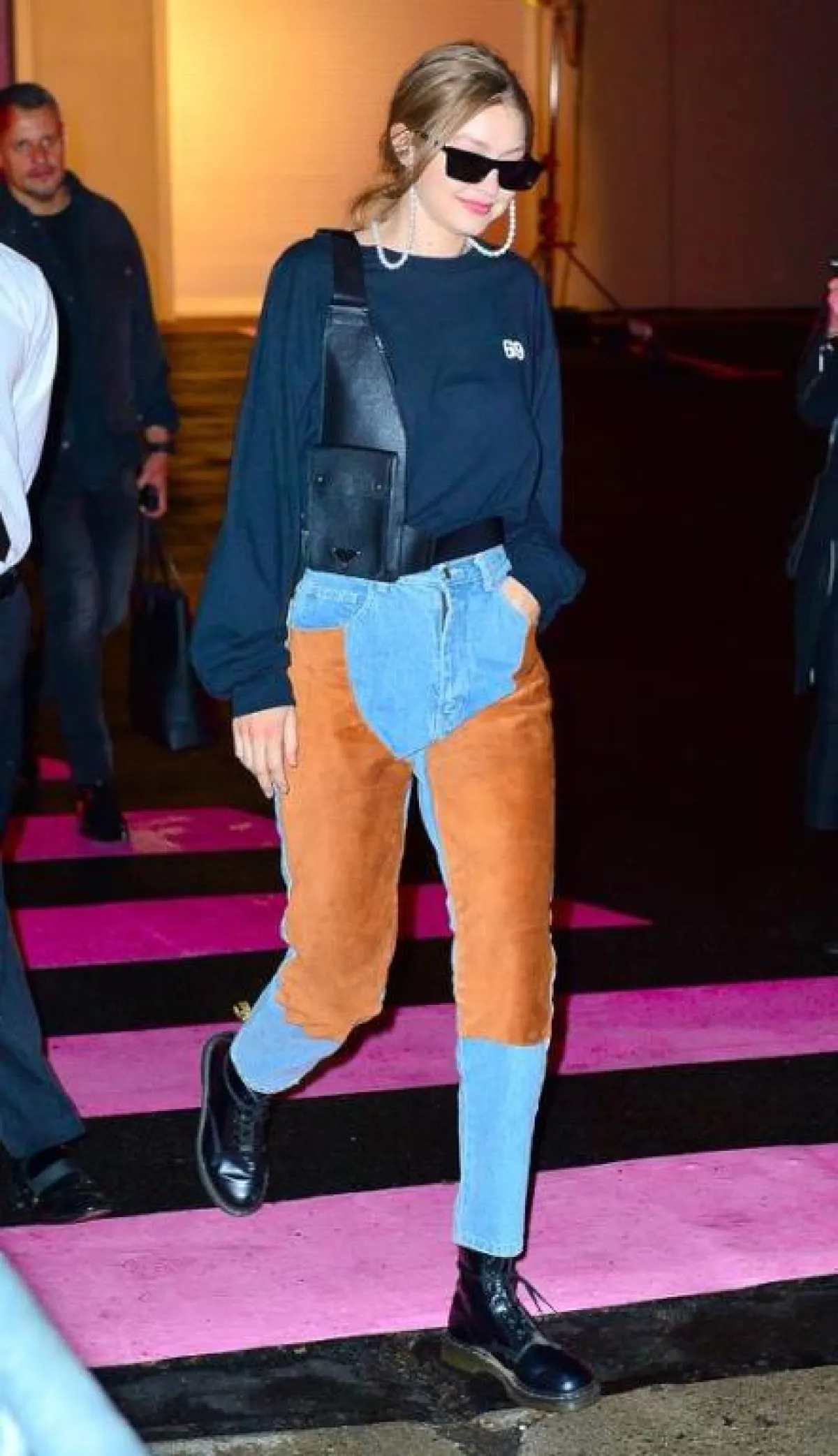 اختارت عارضة الأزياء كيندال جينر جينز الأباء و نسقته مع تي شيرت مكشوف من البطن، وحذاء رياضي ضخم من اتجاهات هذا العام.