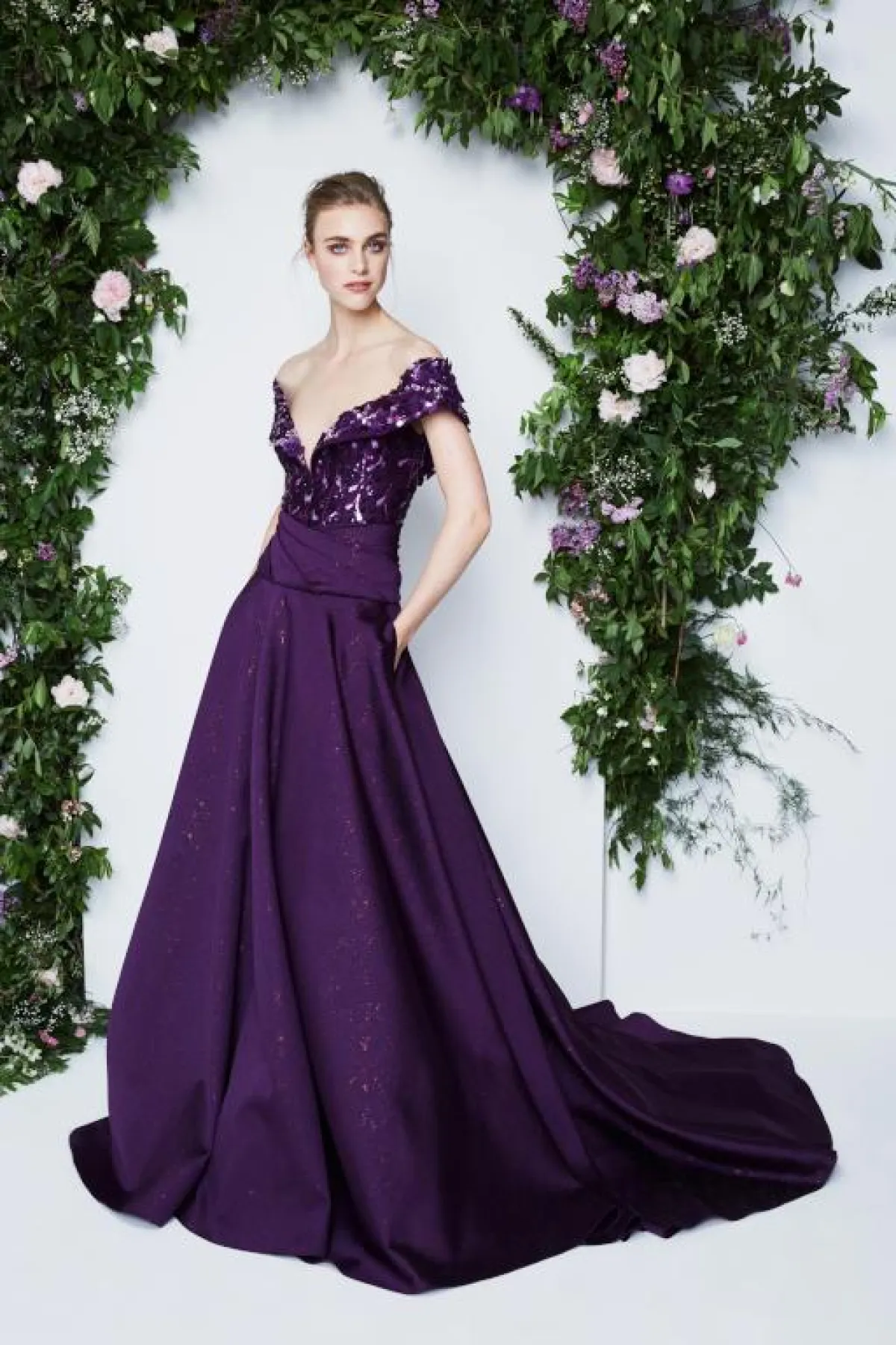 وقدمت ماركة باميلا رولان Pamella Roland فساتين أرجواني تجمع بين النعومة والفخامة، حيث أنها مرصعة بتطريزات برّاقة على القماش الشفاف.
