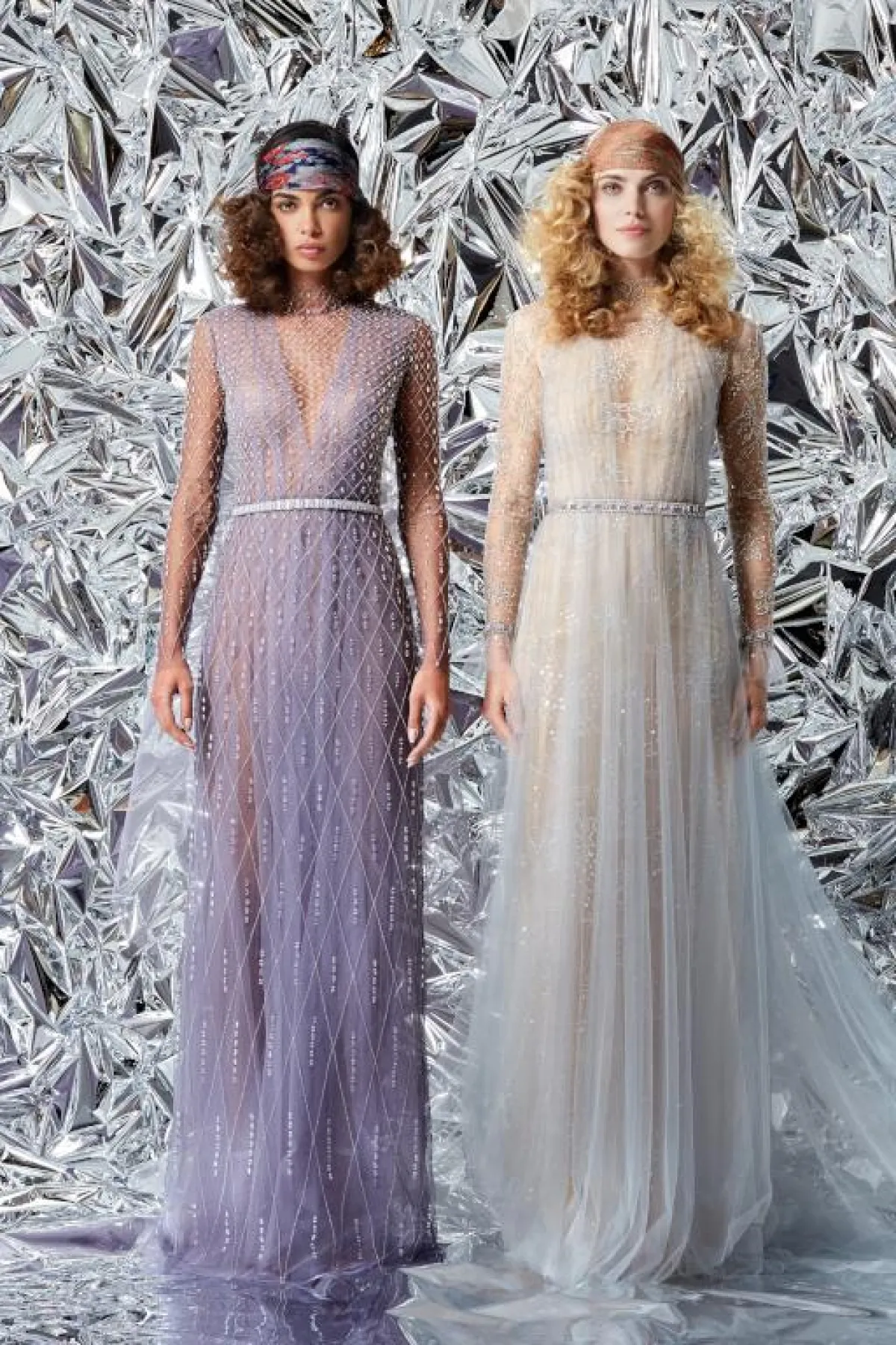 واختار المصمم أقمشة شفافة مع قصّات مختلفة، مثل الفساتين بالقبّة الـV والفساتين بالأكمام الطويلة.