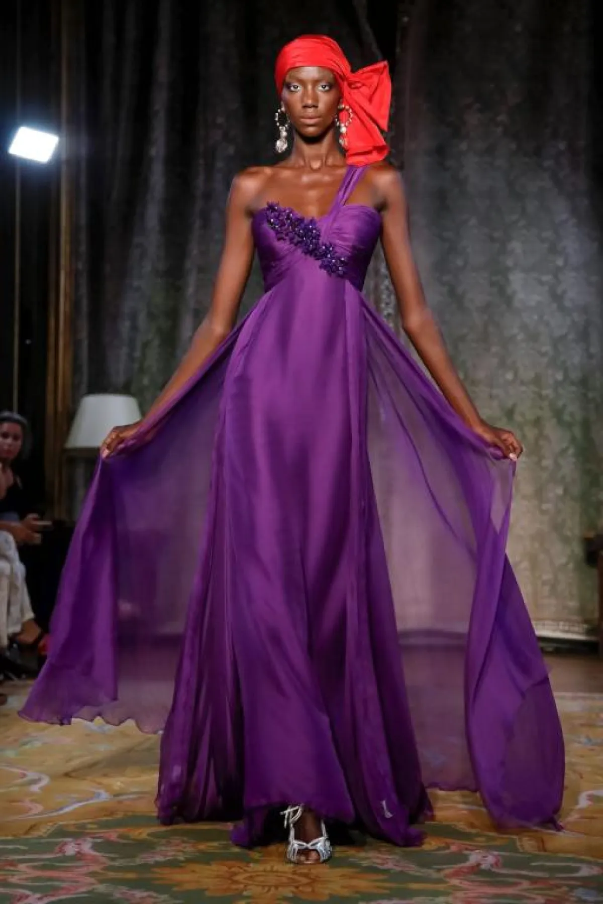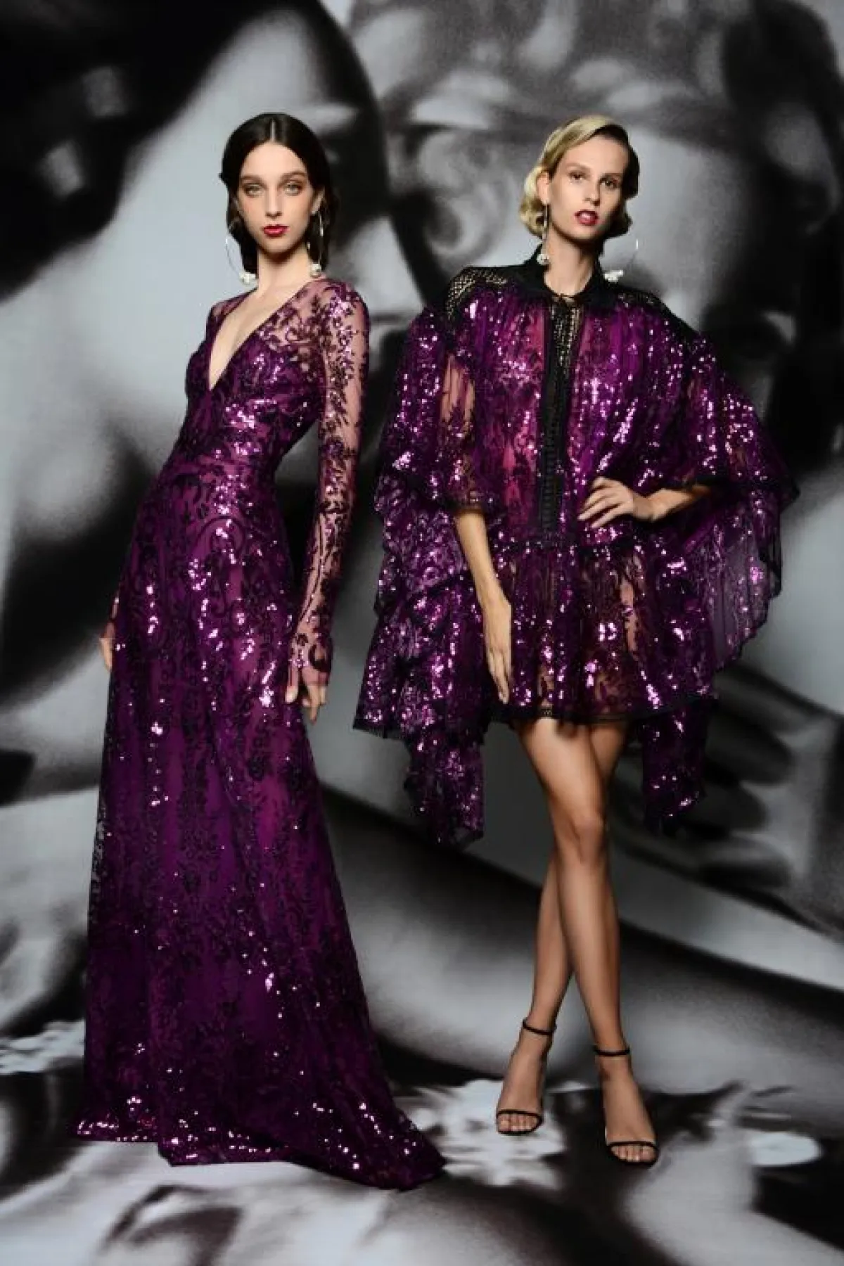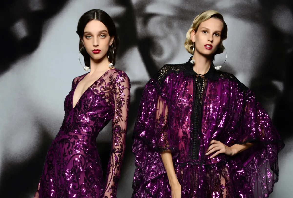 وقدمت ماركة باميلا رولان فساتين أرجواني بدرجة داكنة، تميزت بتصاميمها المنفوشة مع التطريزات البرّاقة التي تزينها.