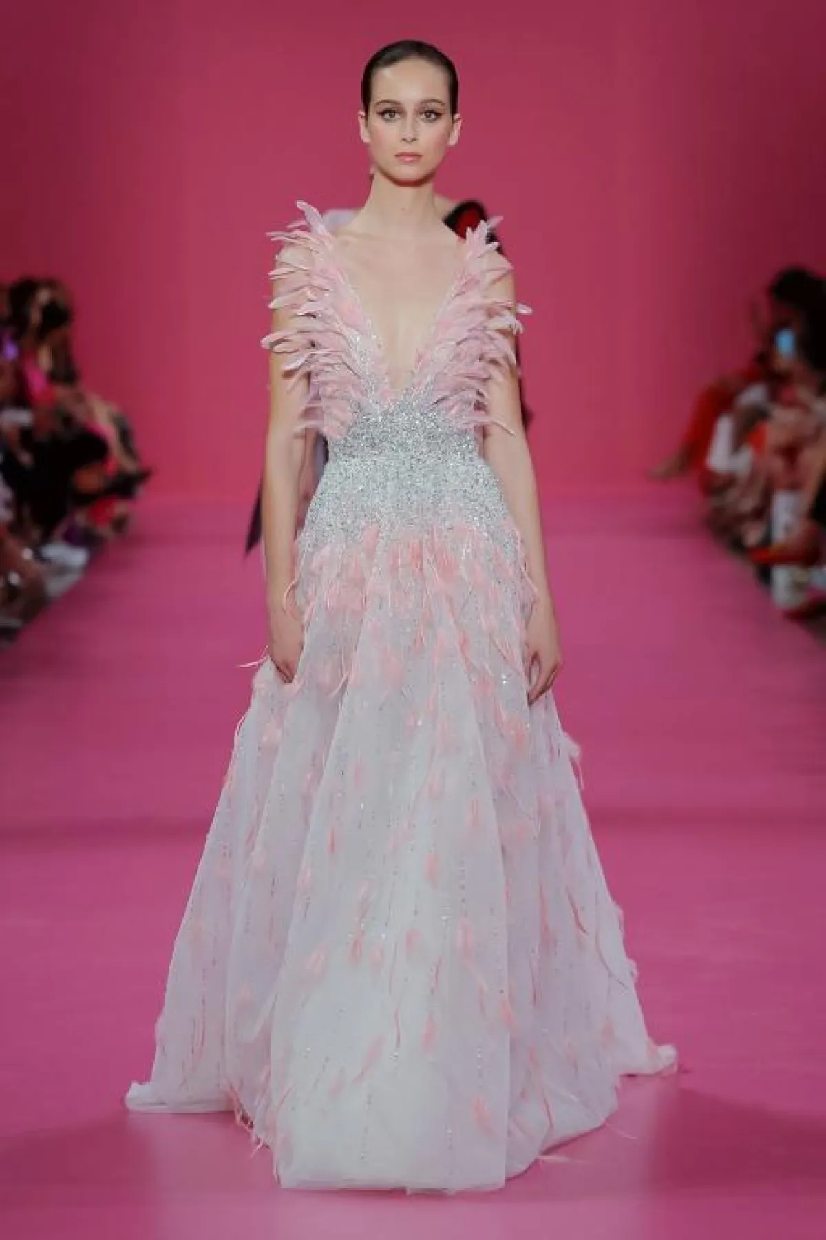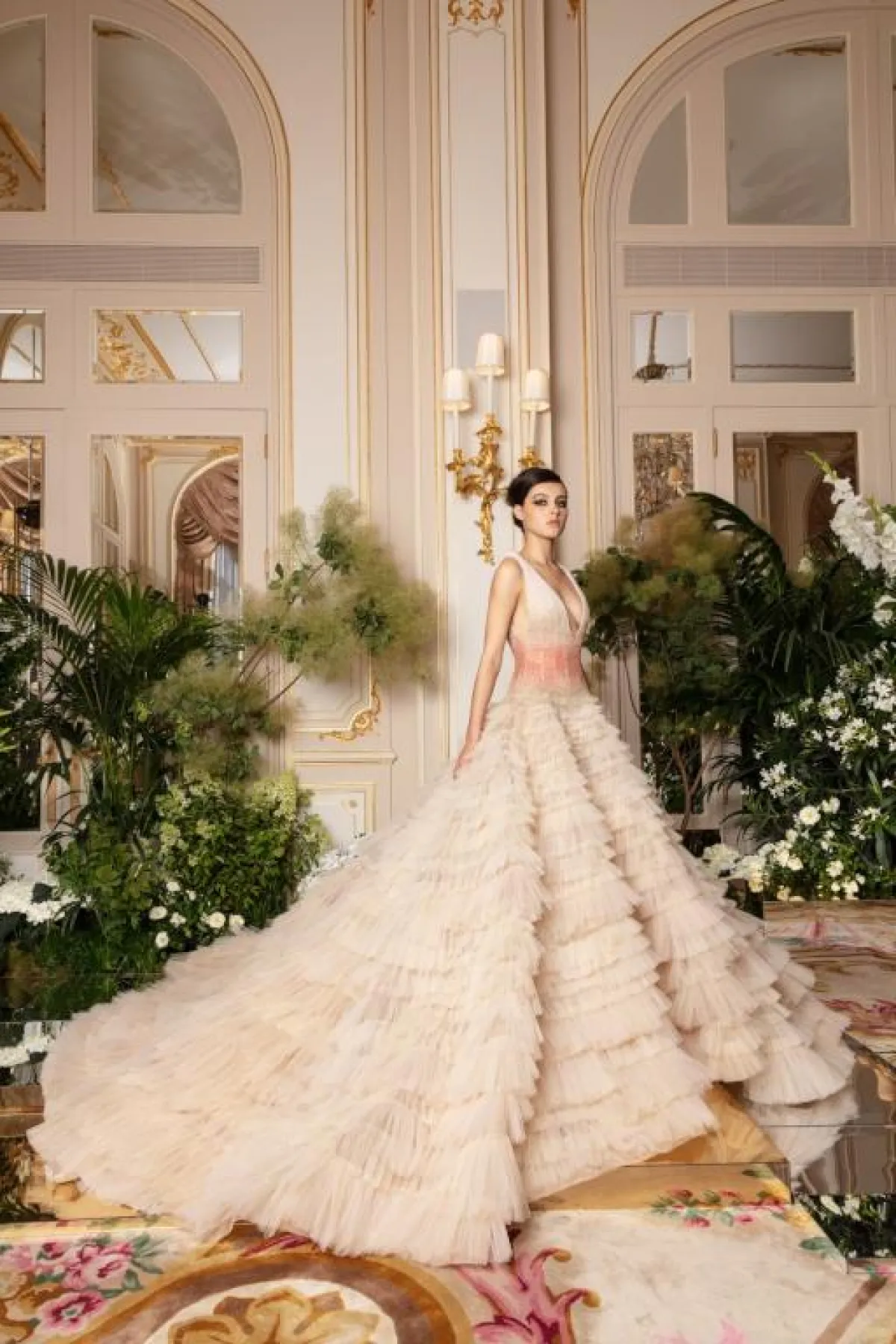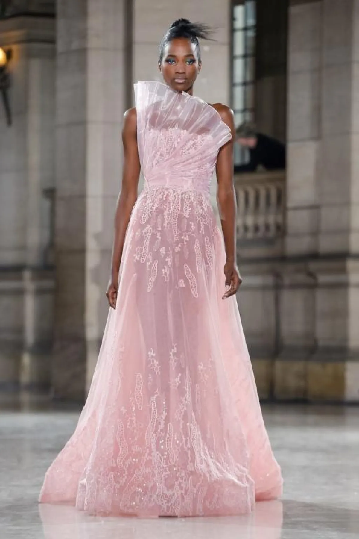 ولمزيد من الفخامة، قدم المصمم فساتين بقصّات منفوشة، مثل الفستان الوردي بالطبقات متعددة الأطوال.