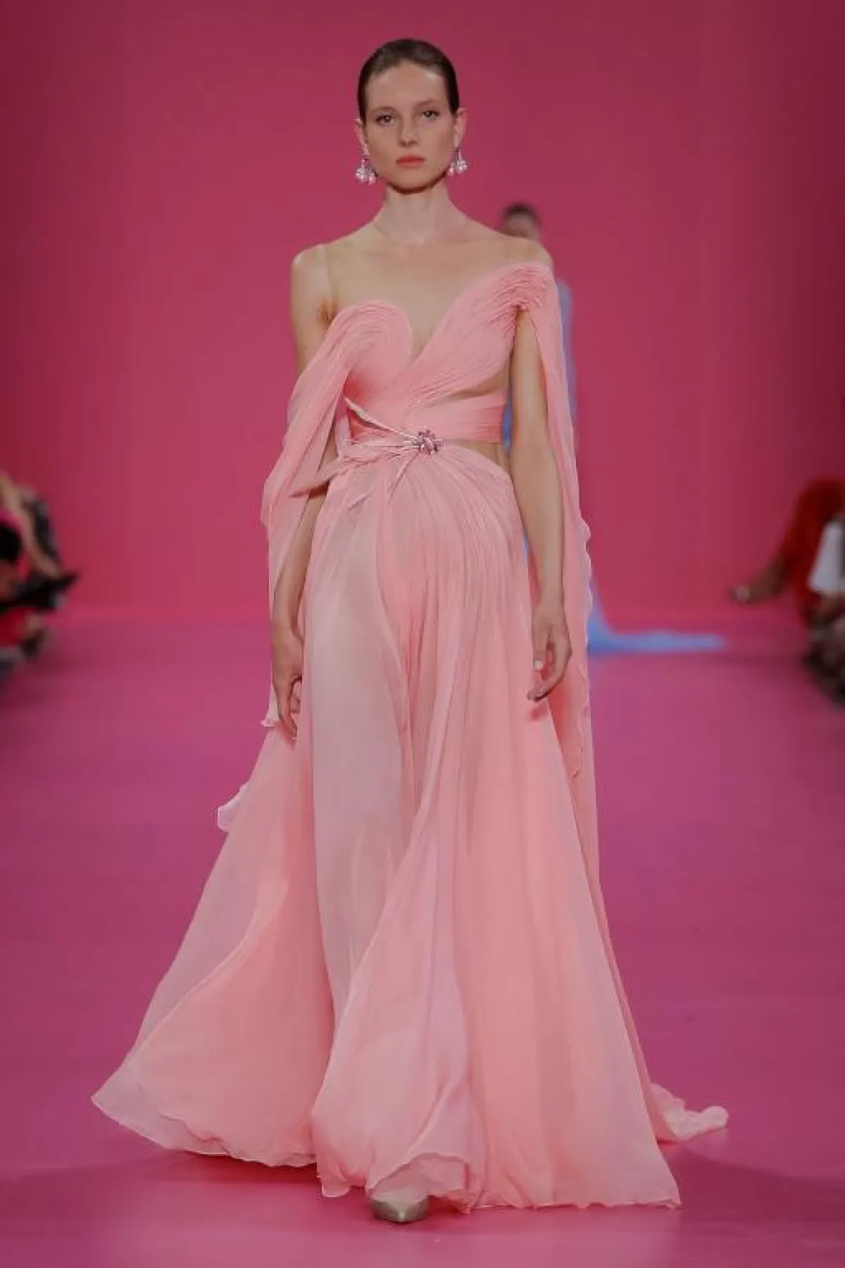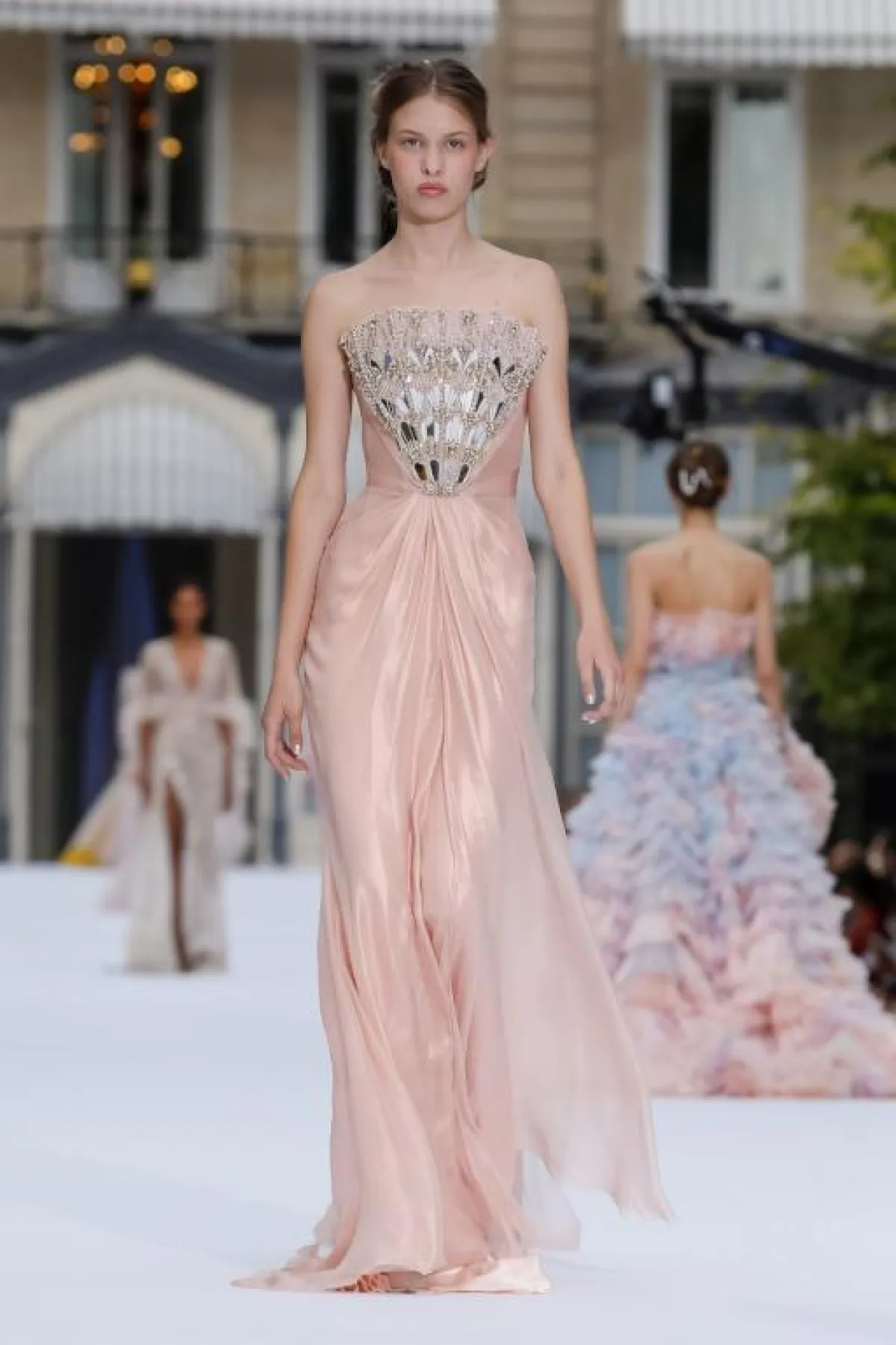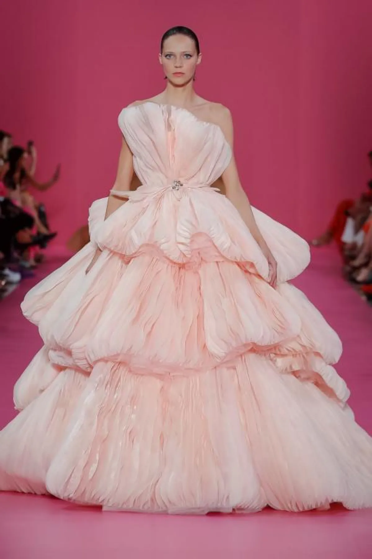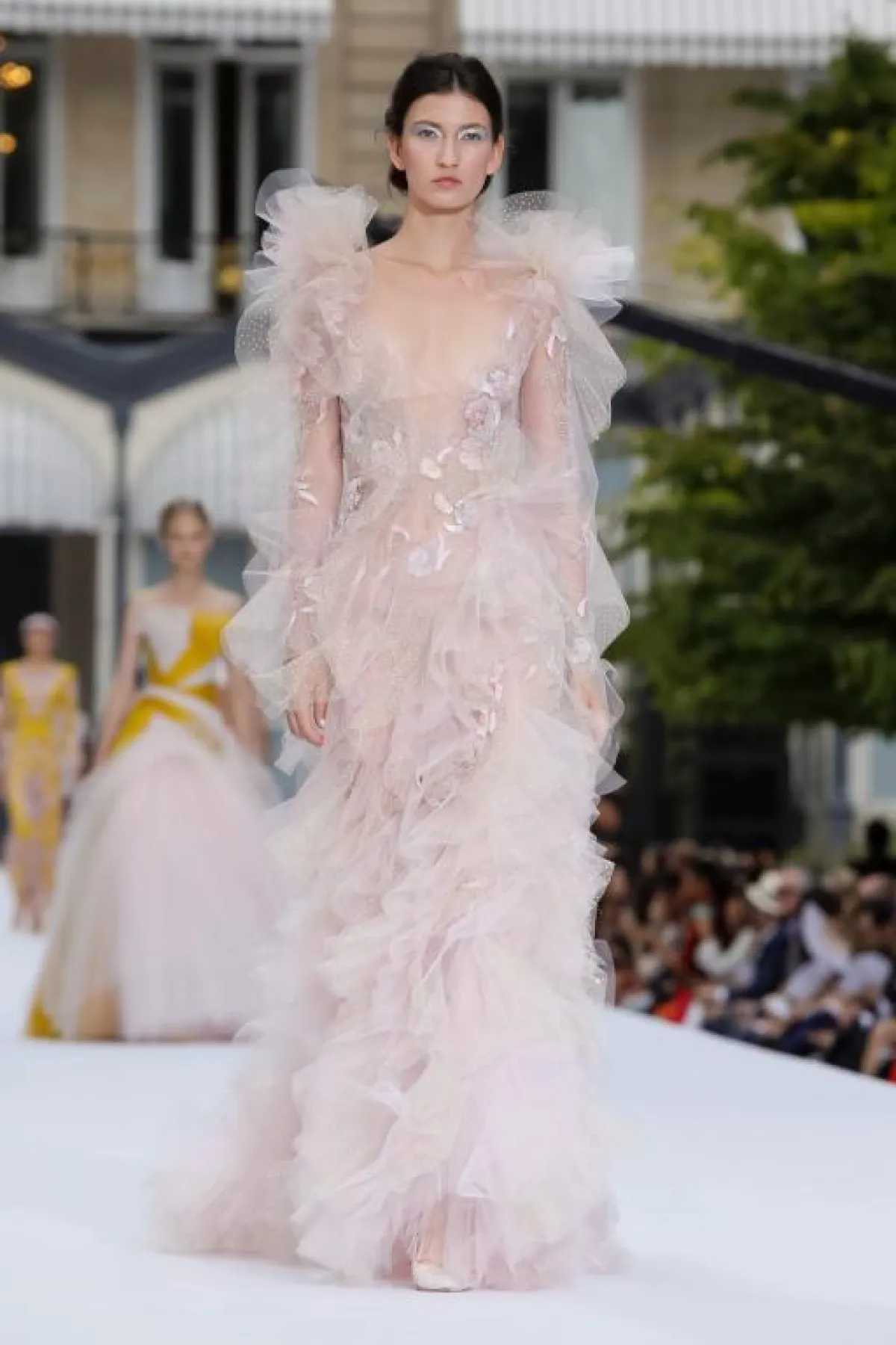 ولمزيد من الفخامة، قدم المصمم فساتين بقصّات منفوشة، مثل الفستان الوردي بالطبقات متعددة الأطوال.