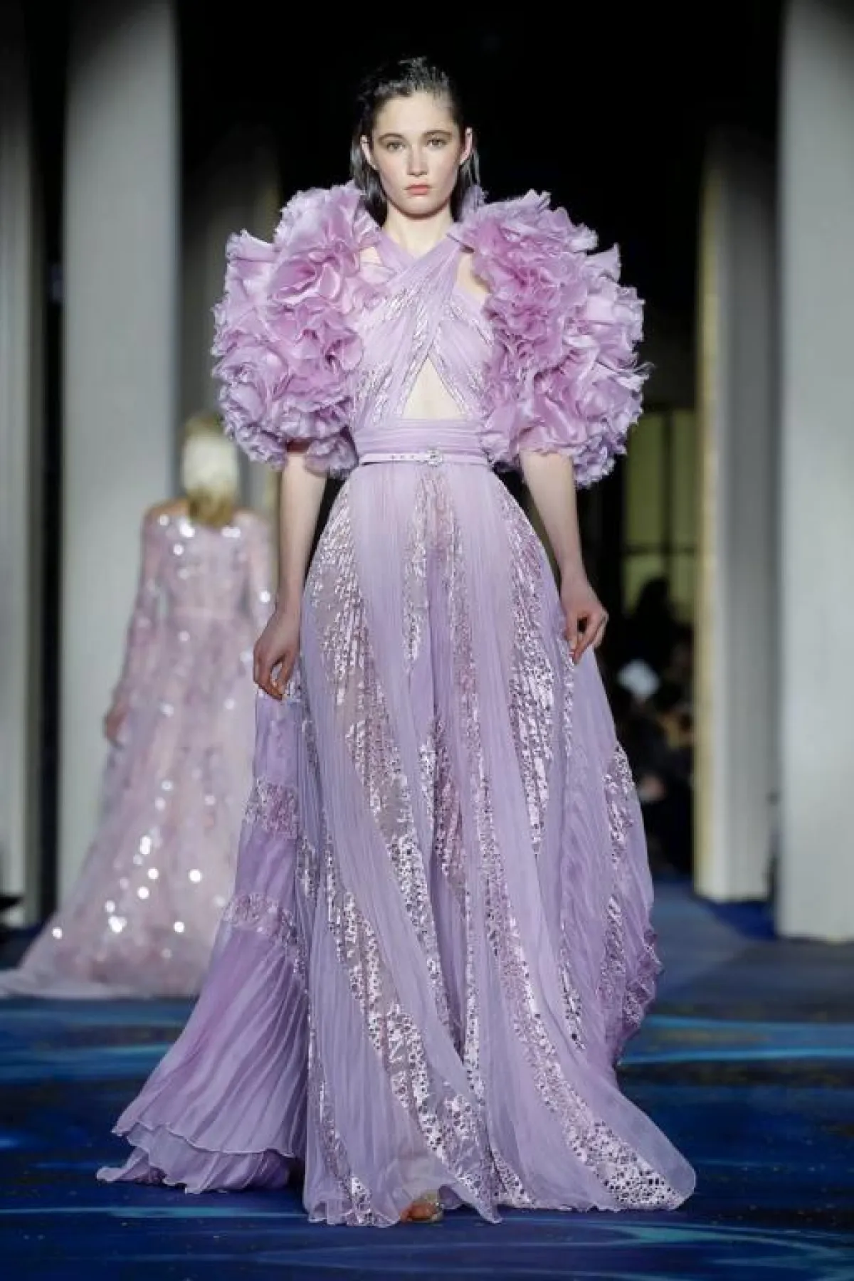 قدم المصمم السوري رامي العلي فساتين ناعمة بألوان الباستيل، ولكنها تبدو فخمة بفضل الأقمشة الراقية المستخدمة، والقصّات المبهرة، والمزينة بتطريزات برّاقة.
