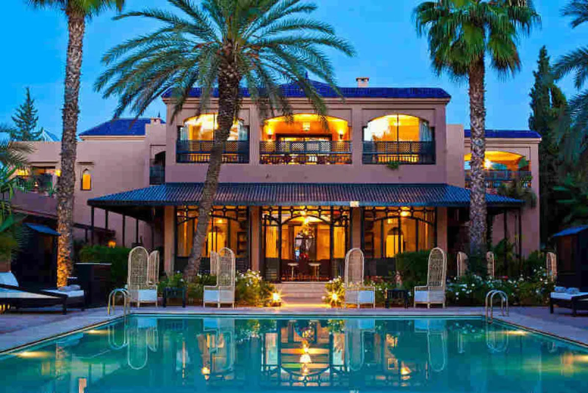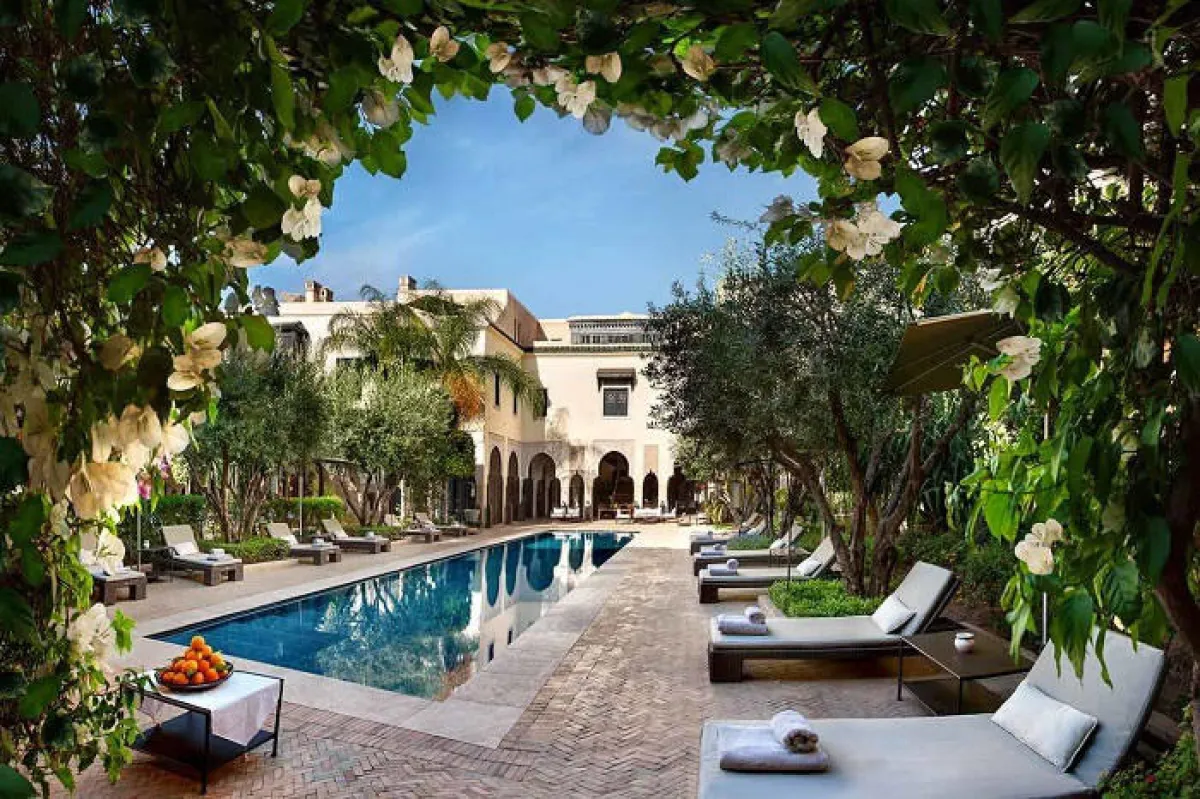 ومع ذلك، فإنّ أفضل أجزاء مراكش تقع خارج جدران التيراكوتا: مجموعة كبيرة من الفنادق التي لا تصدّق، ويبدو أنها تتجاوز تصنيف خمس نجوم، والتي عبر جمالها تقتل أي حافز للذهاب للاستكشاف. فندق رويال منصور، بُني بتكليف من الملك الحالي، يدلل ضيوفه في 53 جناحًا زينت بشكل رائع ، ويتمتع بـ"سبا" حالم. أما فندق أمانجينا فأضاف لمسة مرجانية ووردية على النمط المغربي للبناء، بأقواس ممشوقة، وسقوف عالية وشعور بالخصوصية، ولتشعرا وكأنكما ملكان لا تترددا في التوجه إلى فندق "لا مامونية" بحدائقه الواسعة، ومطاعمه المتعددة، كما لا يجب أن تفوّتا حمّامًا مغربيًّا أصليًّا أثناء وجودكما في المدينة.