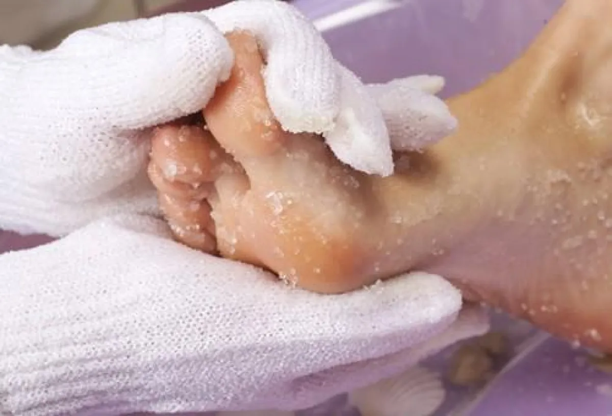 4. تقشير بشرة القدمين مرتين في كل أسبوع مع المقشر المخصص لبشرة القدمين، لأجل التخلص من الأوساخ العالقة على الأسطح وطبقات الخلايا الميتة.