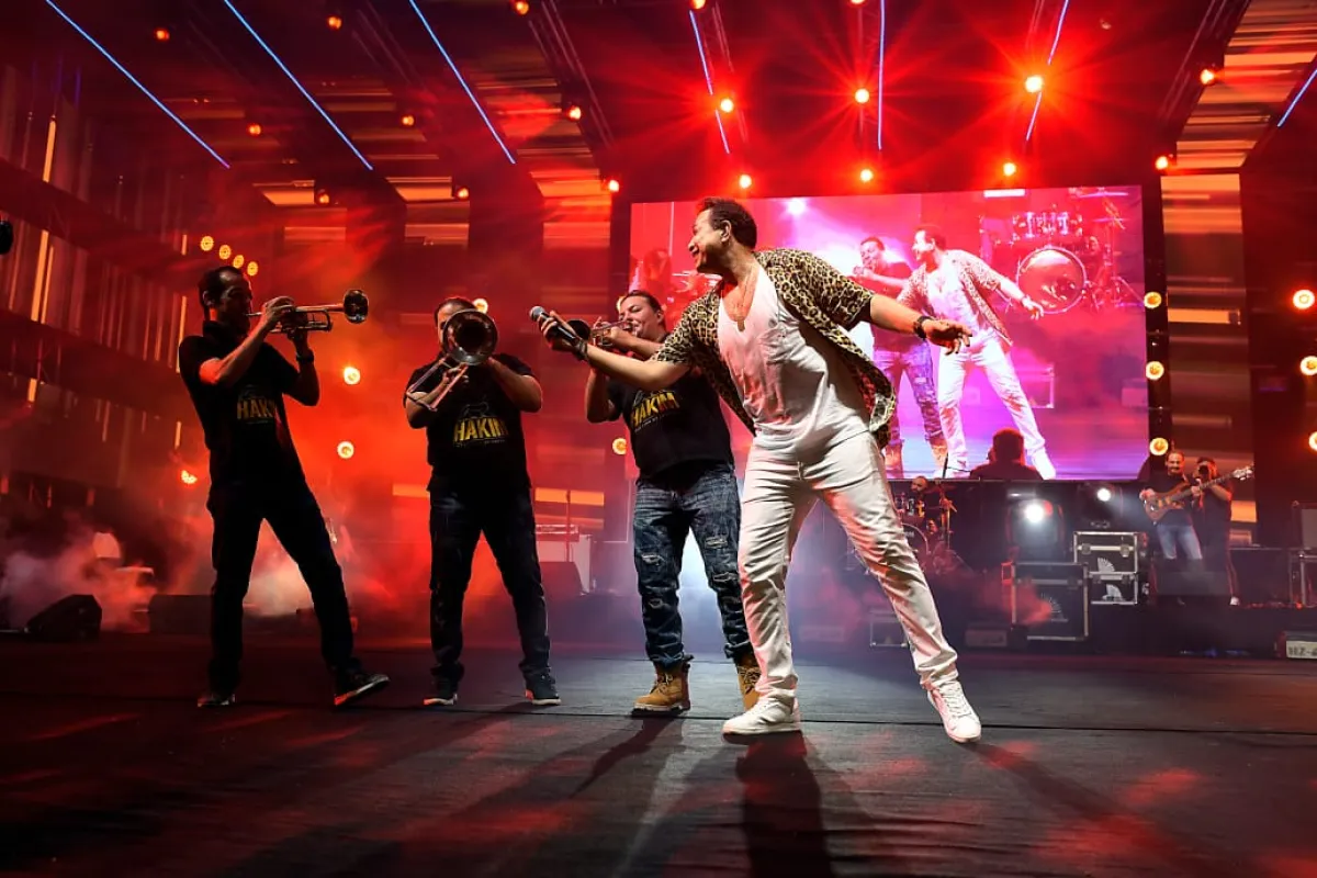حضر حكيم بصحبة مديرة أعماله نانسي إبراهيم، وكامل فرقته الموسيقية التي كان لها دور مميز أثناء الاستعراضات في الحفل مع حكيم على المسرح، حيث قدموا عددًا من العروض المميزة على المسرح بالعزف على الآلات المختلفة، مع رقص وغناء حكيم الذي أشعل حماس جمهور الحفل منذ بدايته.