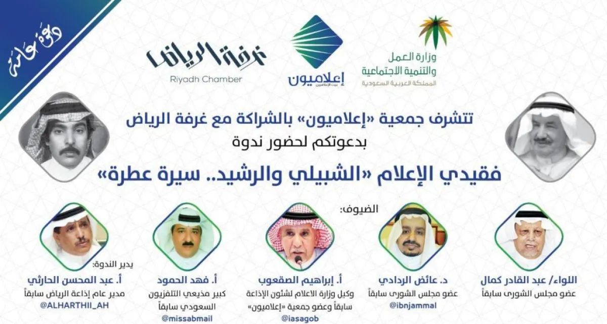 في إطار نشاطاتها السنوية، ودورها تجاه الإعلام والإعلاميين بوصفها بيت الإعلاميين، تنظم جمعية «إعلاميون»، بالشراكة مع «غرفة الرياض»" مساء غدٍ الاثنين، ندوة إعلامية عن فقيدَي الإعلام السعودي واثنين من رموزها الدكتور عبدالرحمن الشبيلي، والمذيع المخضرم محمد الرشيد، رحمهما الله، بعنوان "الشبيلي والرشيد.. سيرة عطرة" في قاعة الشيخ عبدالعزيز المقيرن.