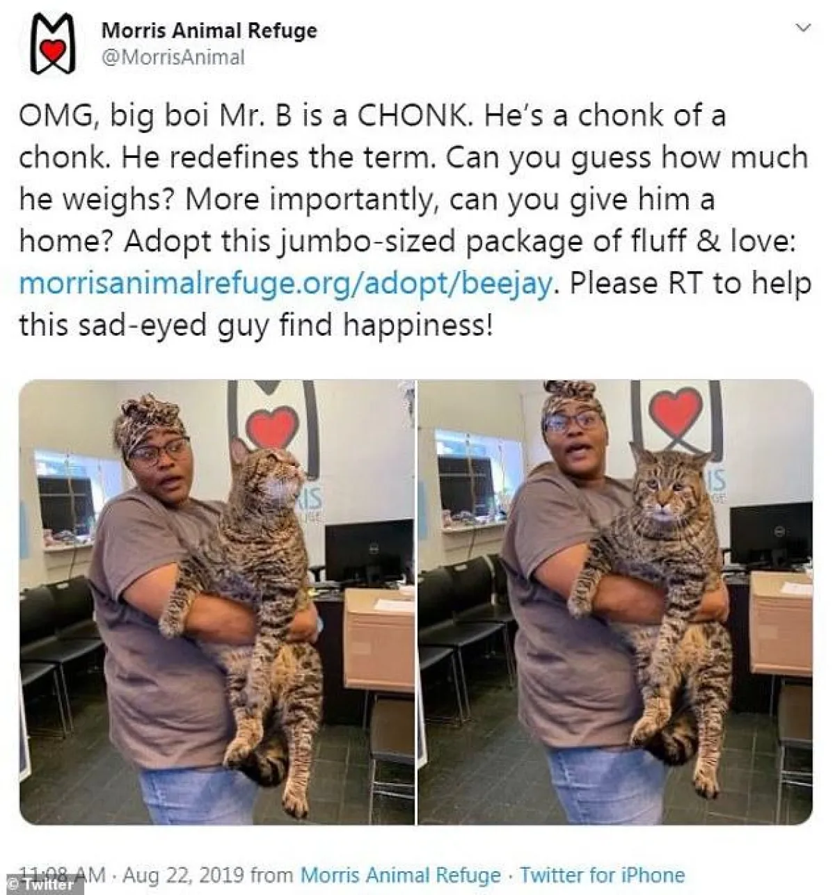وكان ملجأ «موريس» للحيوانات الأليفة، الواقع في مدينة «فيلاديلفيا» أكبر مدن ولاية «بينسلفينيا»، وخامس أكبر مدن الولايات المتحدة، قد نشر على صفحاته الاجتماعية صورة لقط عملاق وسمين يُدعى «السيد بي»، يصل وزنه إلى قرابة الـ12 كيلوغراماً، وطوله قرابة المتر الواحد، وطلبوا ممن يود تبني هذا الضخم اللطيف أن يتواصل معهم لإنجاز ذلك.