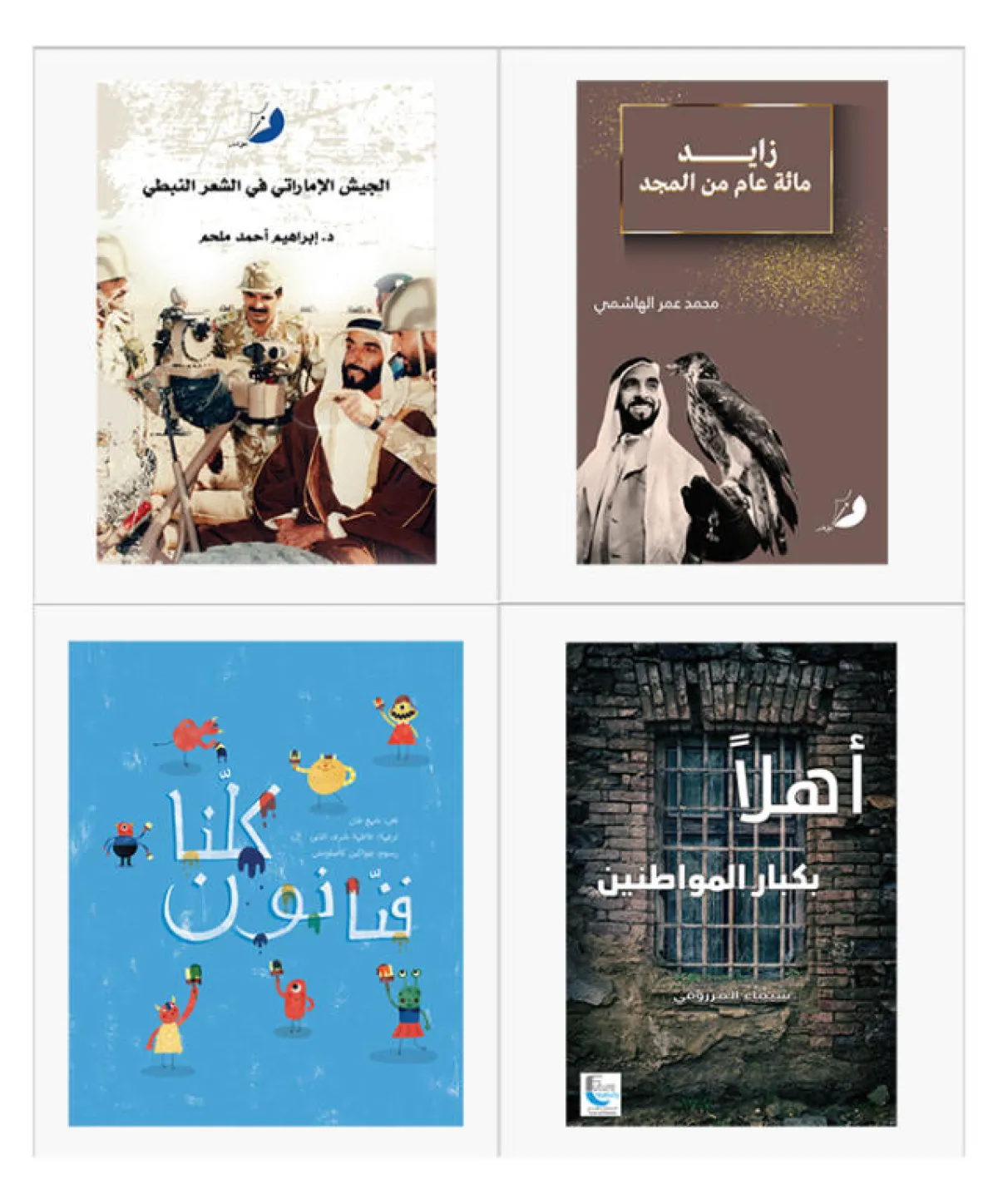 من خلال عناوينها الجديدة فتحت المبادرة نافذة على الأدب والمؤلفات التي تروي تاريخ الدولة، وتعالج القضايا المجتمعية، حيث دعمت كتاباً بعنوان: "زايد مئة عام من المجد" للكاتب محمد عمر الهاشمي، وكتاب "أهلاً بكبار المواطنين" للمؤلفة شيماء المزروعي، وكتاب "الجيش الإماراتي في الشعر النبطي"، للمؤلف إبراهيم أحمد ملحم، وكتاب "كلنا فنانون"، من تأليف شمع خان، ترجمة الكاتبة فاطمة شرف الدين.