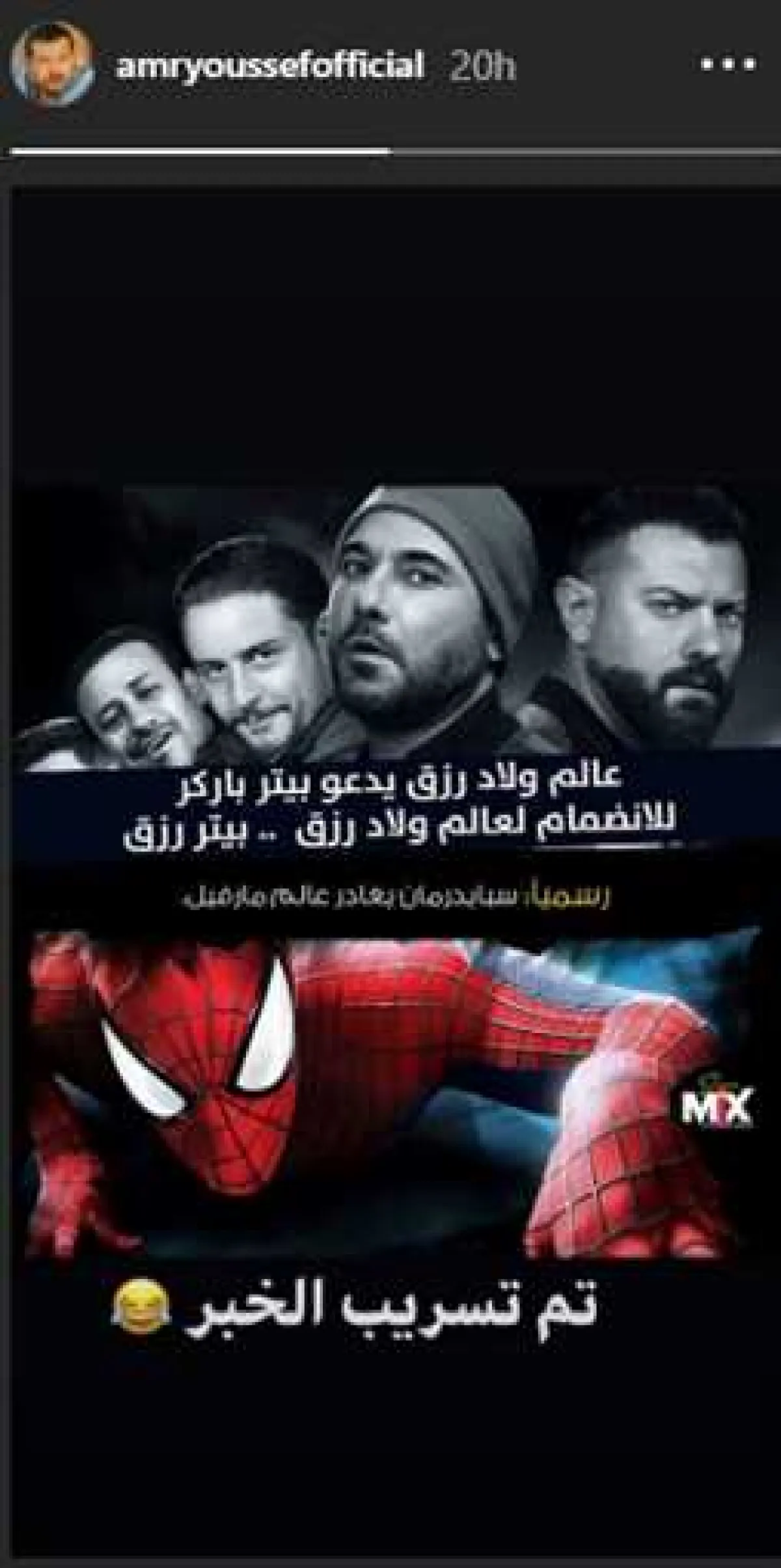 ورافق الصورة تعليق "عالم ولاد رزق يدعو بيتر باركر للانضمام لعالم ولاد رزق، بيتر رزق، رسميًا سبايدر مان يغادر عالم مارفيل"، فيما سخر عمرو يوسف من الخبر بقوله :"تم تسريب الخبر ".
