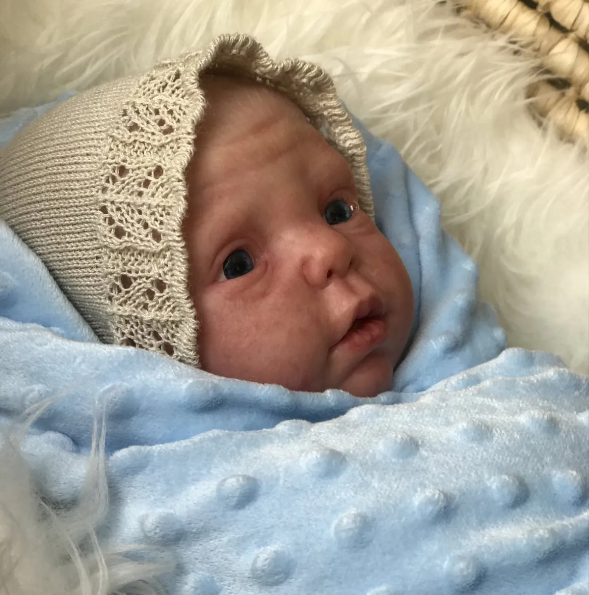 إذا دققت بشعر الطفل الحريري وبشرته الناعمة، فلن يخطر في بالك أن ذلك الطفل هو في الواقع دمية حملت مواصفات يصعب تفريقها عن الولد الحقيقي.