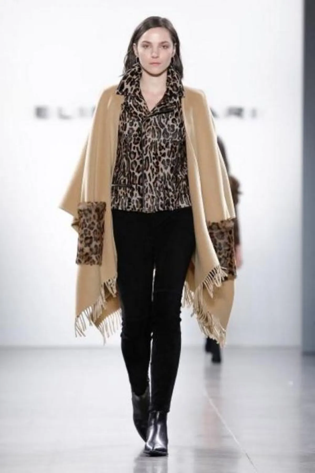 - تألقت عارضة إيلي تهاري Elie Tahari بسترة قصيرة بطبعة النمر وعلى طريقتها يمكنك تنسيقها مع كاب جملي فاتح وبنطال أسود.