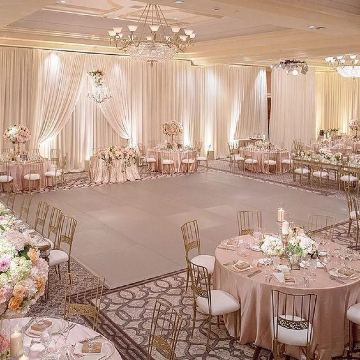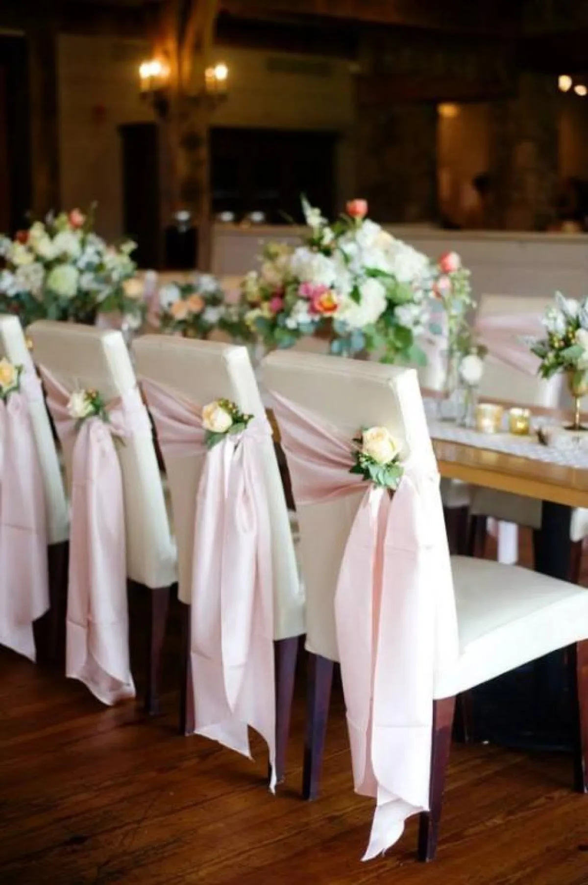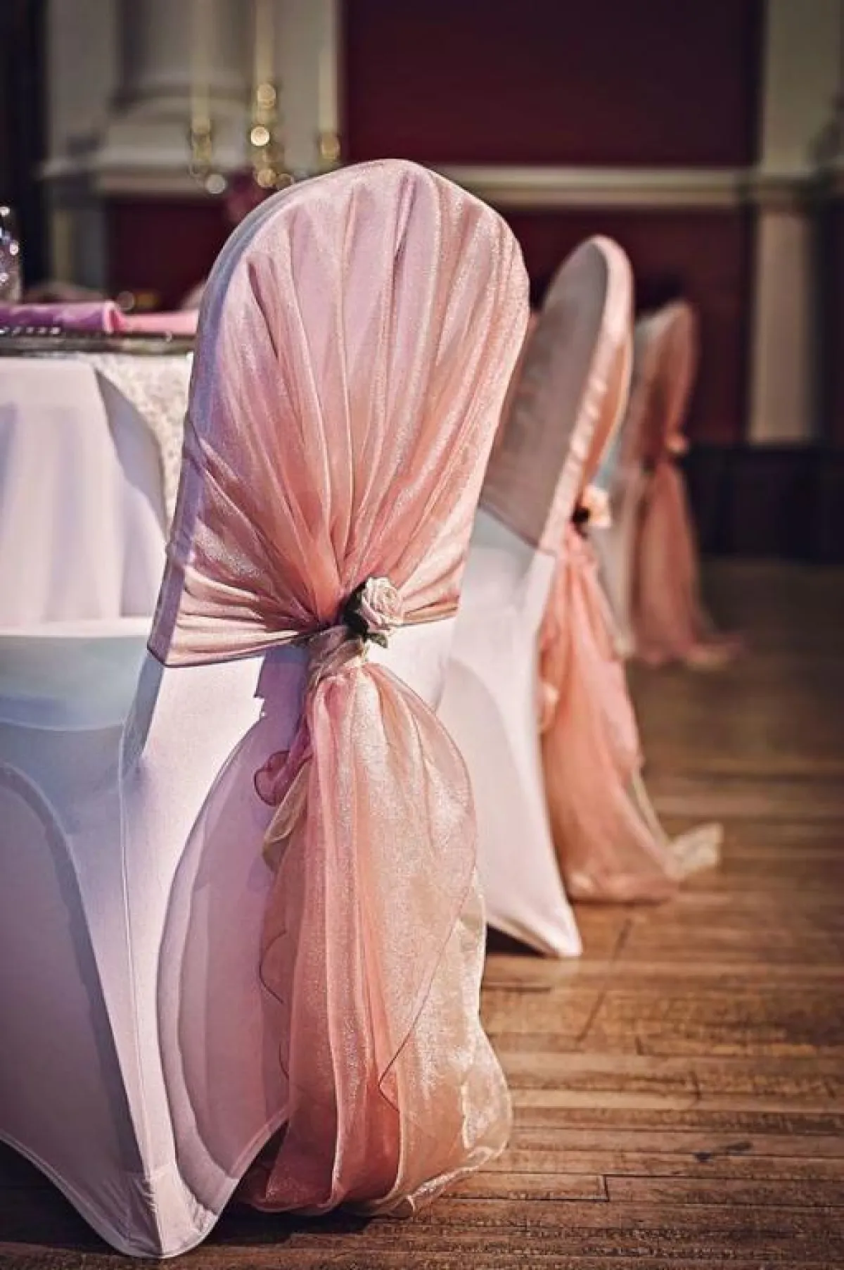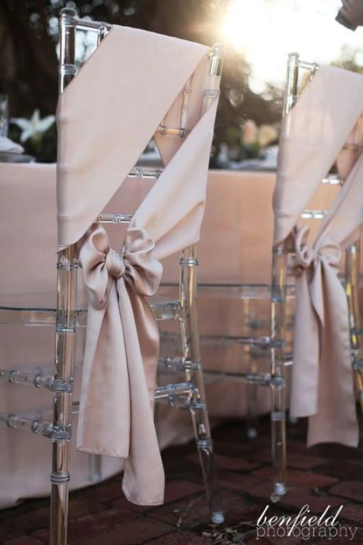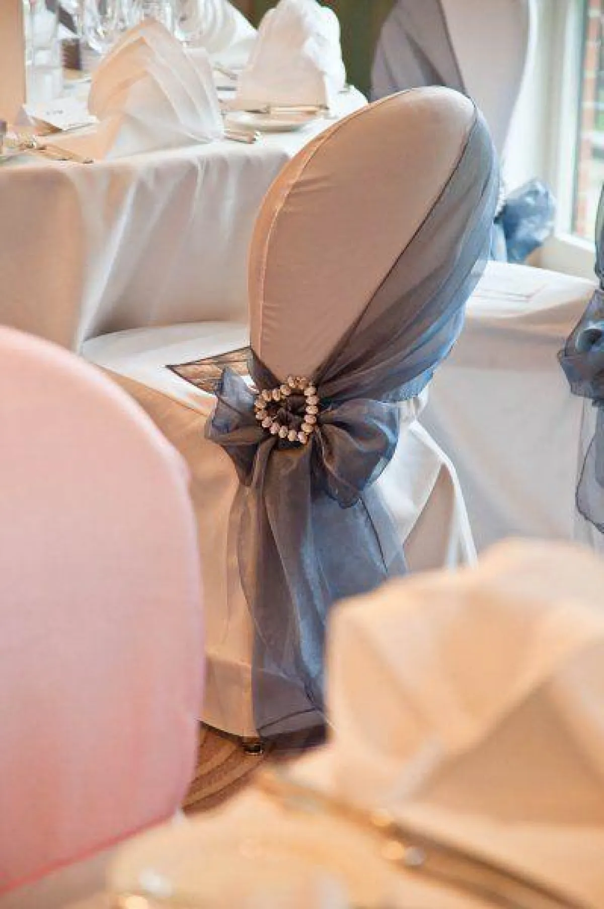 بين التول والدانتيل والأورغانزا، حاولي دائمًا أن تضيفي لمسة من هذه الأقمشة على الكراسي، للمسة مميزة ومبهجة بحفل الزفاف، مع ربطات على الجنب، أو بالمنتصف، مع لمسة من الورود الملونة بظهر الكرسي، لتبدو القاعة من بعيد كالحديقة.