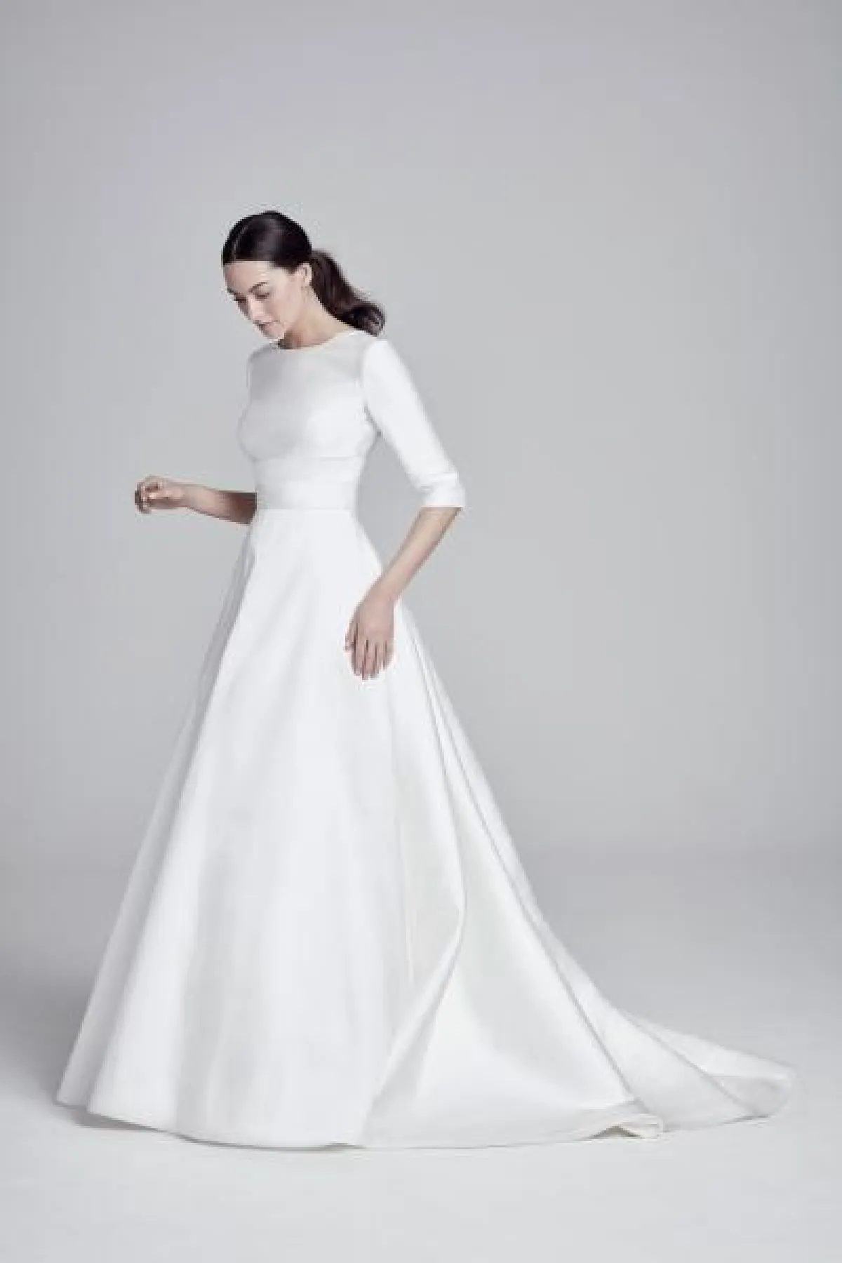 كما قدمت ماركة Suzanne Neville فستان كلاسيكي منفوش بأكمام طويلة يجمع بين الفخامة والإحتشام.