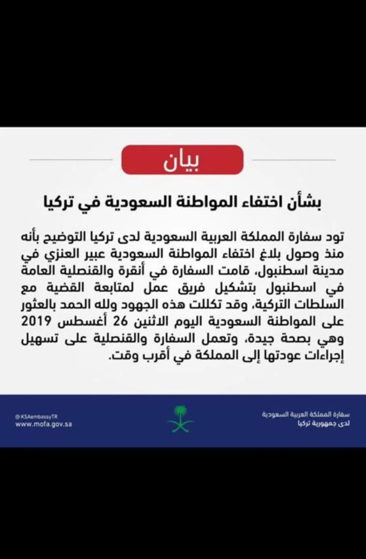 ومن جانب آخر أصدرت السفارة السعودية بتركيا بيان ذكرت فيه: "قامت السفارة في أنقرة والقنصلية العامة في أسطنبول بتشكيل فريق عمل لمتابعة القضية مع السلطات التركية، وقد تكللت الجهود ولله الحمد بالعثور عليها يوم الاثنين، وهي بصحة جيدة، وتعمل السفارة والقنصلية على تسهيل إجراءات عودتها للسعودية في أقرب وقت".