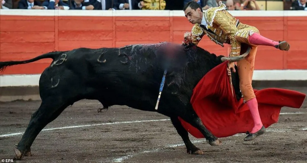 ولوحظ مصارع الثيران، الذي يرتدي سترة ذهبية اللون، تتلألأ تحت ضوء الشمس، مع جوارب برتقالية، وهو يُعبر عن ألمه الشديد، بينما يندفع الثور الهائج بقرونه بين ساقيه، وفي هذه اللحظة يفقد المصارع سيطرته على الثور الغاضب.