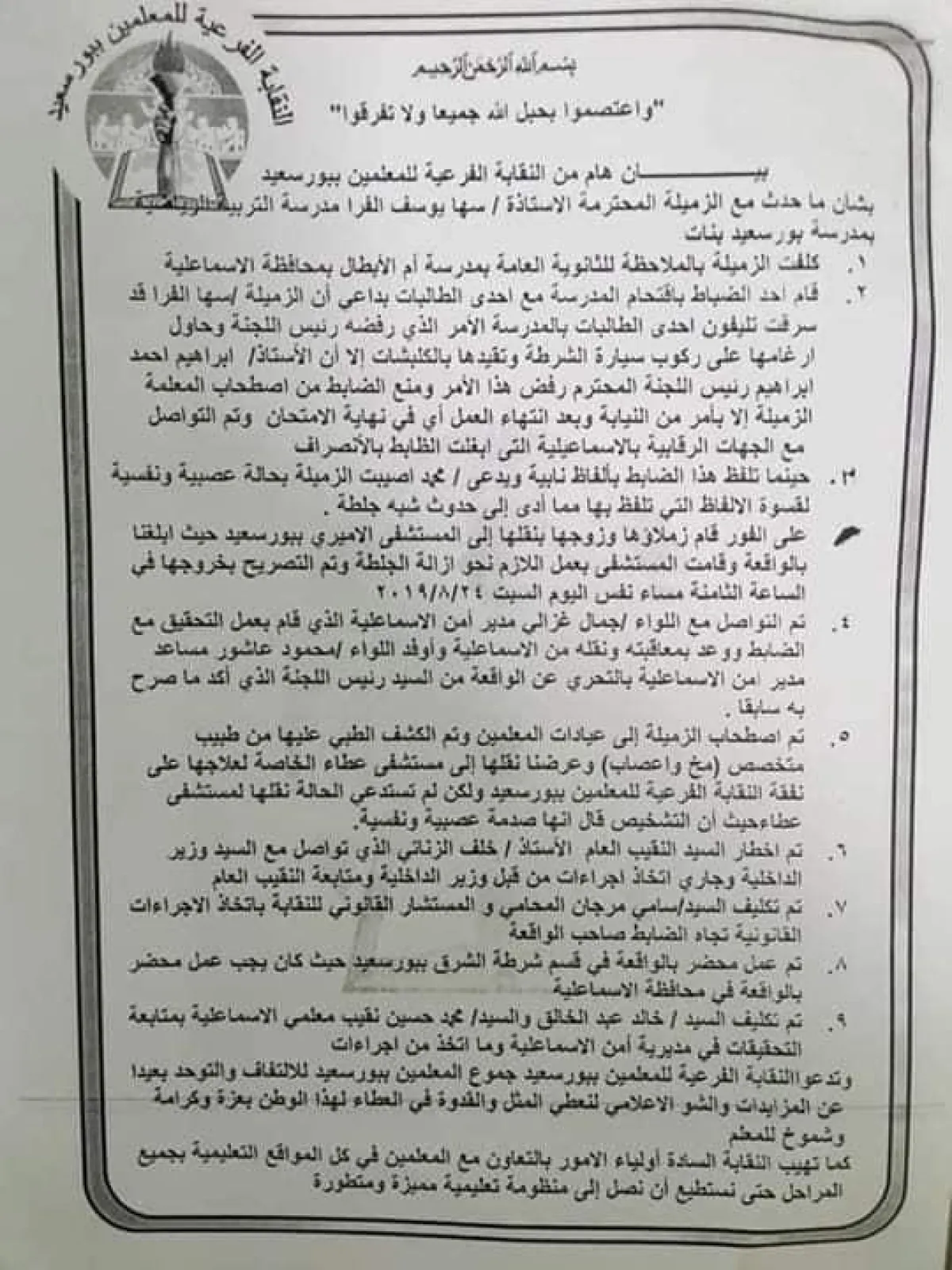 وبحسب البيان أيضاً، فقد قام فرع نقابة المعلمين في بور سعيد، كان قد تواصل مع اللواء جمال غزالي مدير أمن الاسماعيلية، الذي قام بدوره بفتح تحقيق مع الضابط الذي قام بالحادثة. كما وعد اللواء الغزالي بمعاقبة ونقل الضابط المذكور من مكان عمله. كما تواصلت النقابة في الوقت نفسه مع النقيب العام للمعلمين، خلف الزناتي، الذي تواصل مع وزير الداخلية، وجار اتخاذ الإجراءات اللازمة من قبل الوزير.