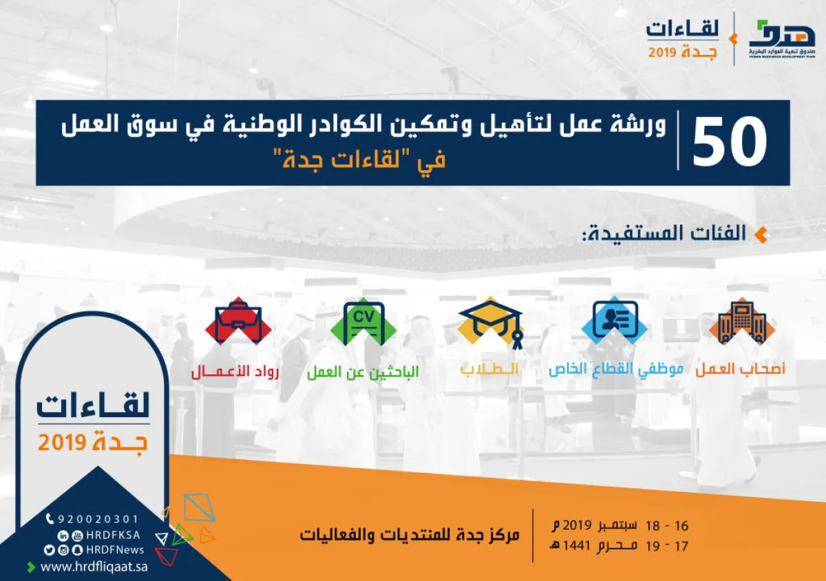يحتضن ملتقى لقاءات جدة 2019، الذي ينظمه صندوق تنمية الموارد البشرية (هدف)، منتصف سبتمبر المقبل، 50 ورشة عمل متخصصة في تأهيل وتدريب وتمكين الموارد البشرية الوطنية في سوق العمل، وموجهة للطلاب والطالبات ورواد ورائدات الأعمال والباحثين والباحثات عن عمل، وأصحاب الأعمال والموظفين.