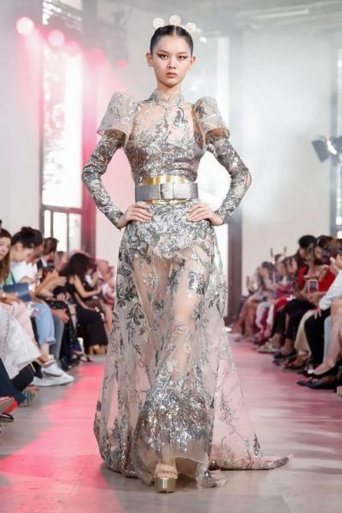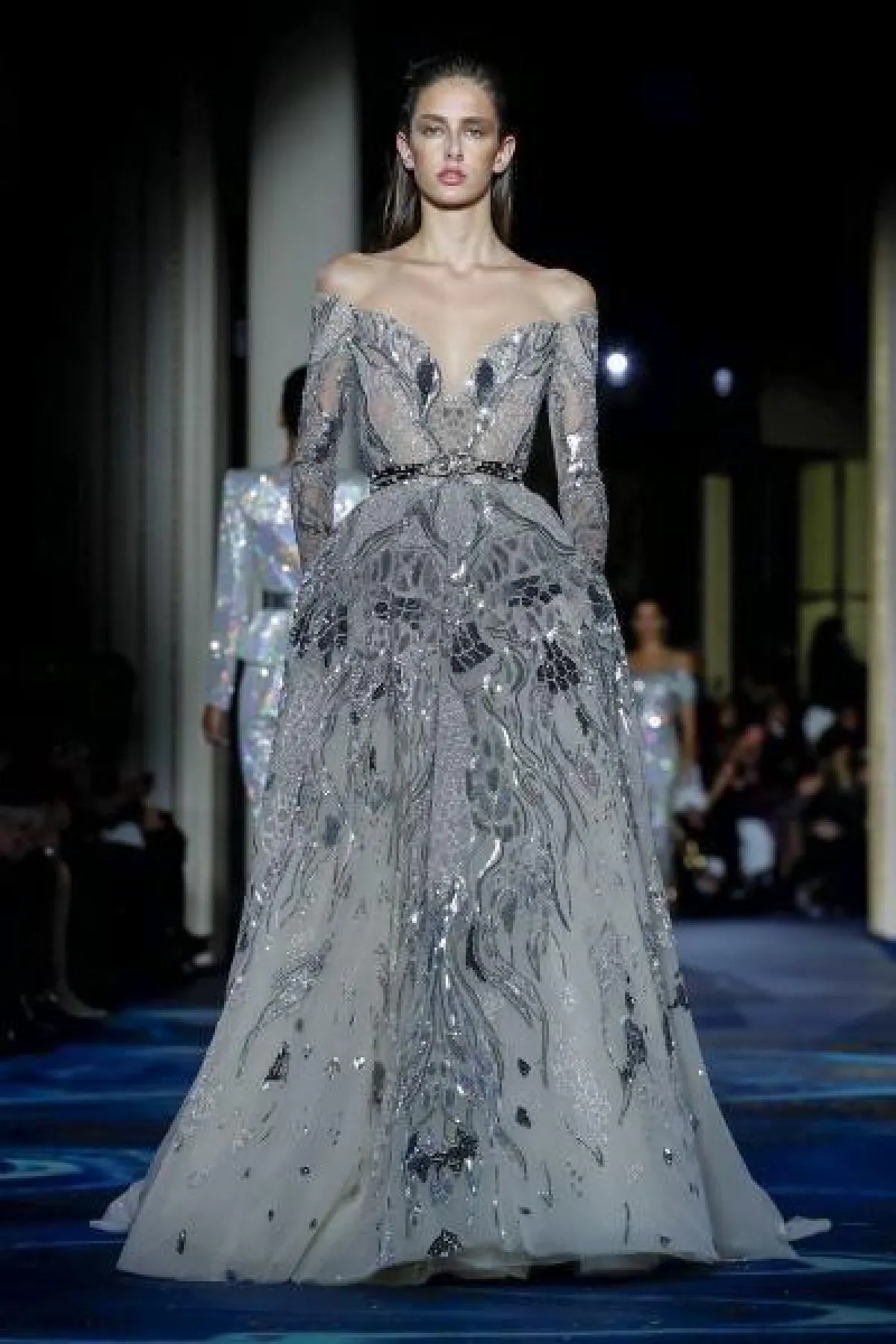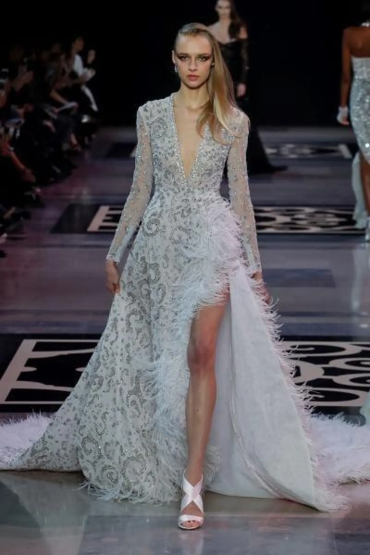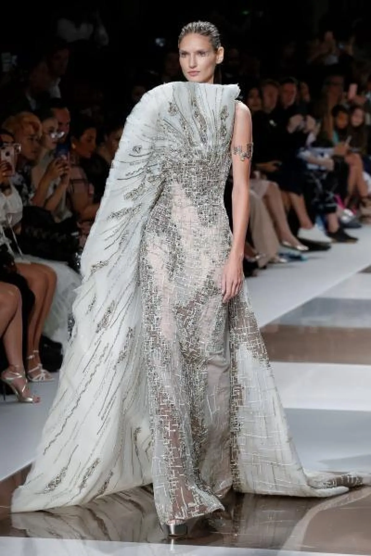 قدم المصمم ايلي صعب فساتين راقية بالأقمشة الشفافة، وتزينت الفساتين بتطريزات برّاقة باللون الفضي.