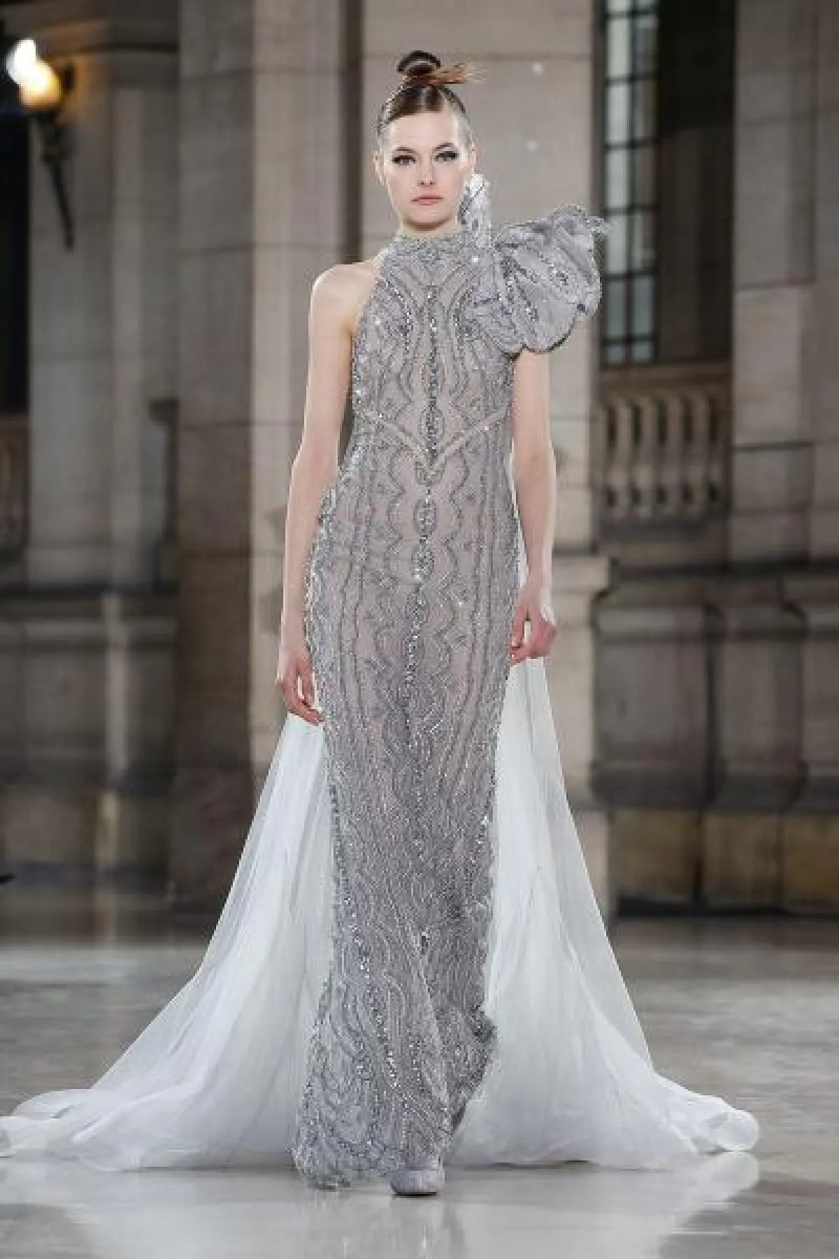 أيضاً قدم المصمم اللبناني جورج شقرا Georges Chakra فستان سلفر منفوش ومزين بزخارف فضية.
