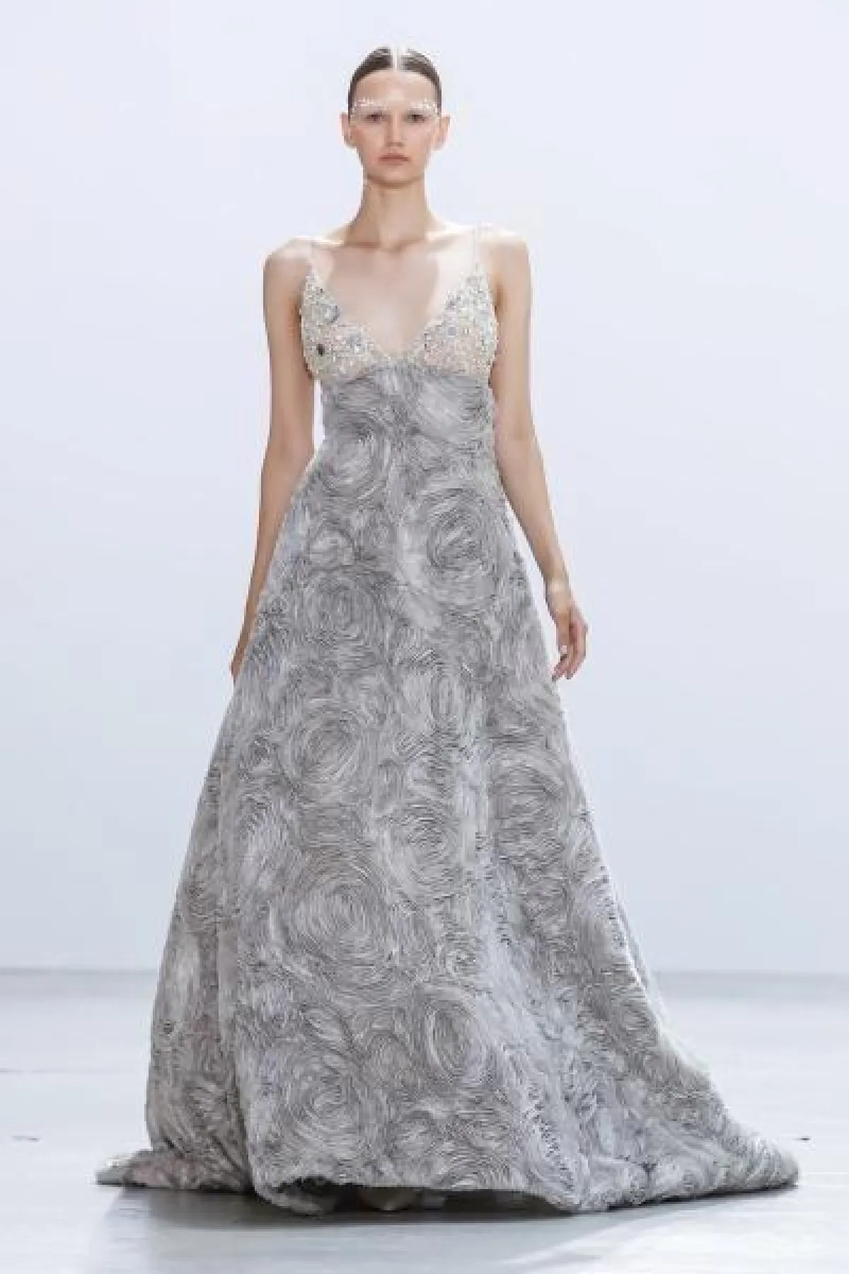 فقدم المصمم فساتين منفوشة Ball Gown، وأخرى بقصّات عمودية، فضلاً عن الفساتين بقصّة ذيل السمكة.