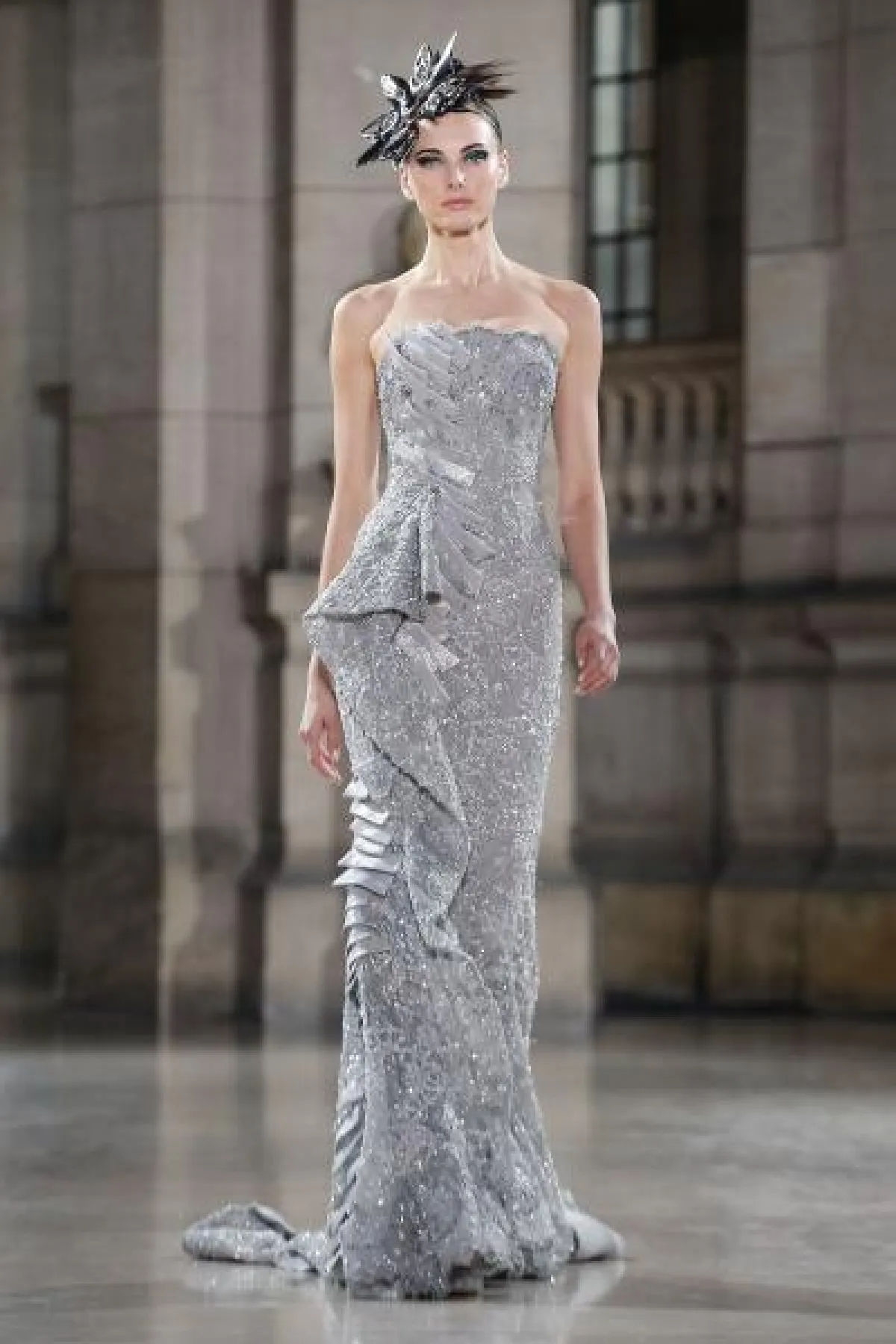 كما قدم المصمم فستان فضي بتصميم ناعم ومزين بكشاكش على أحد الكتفين.