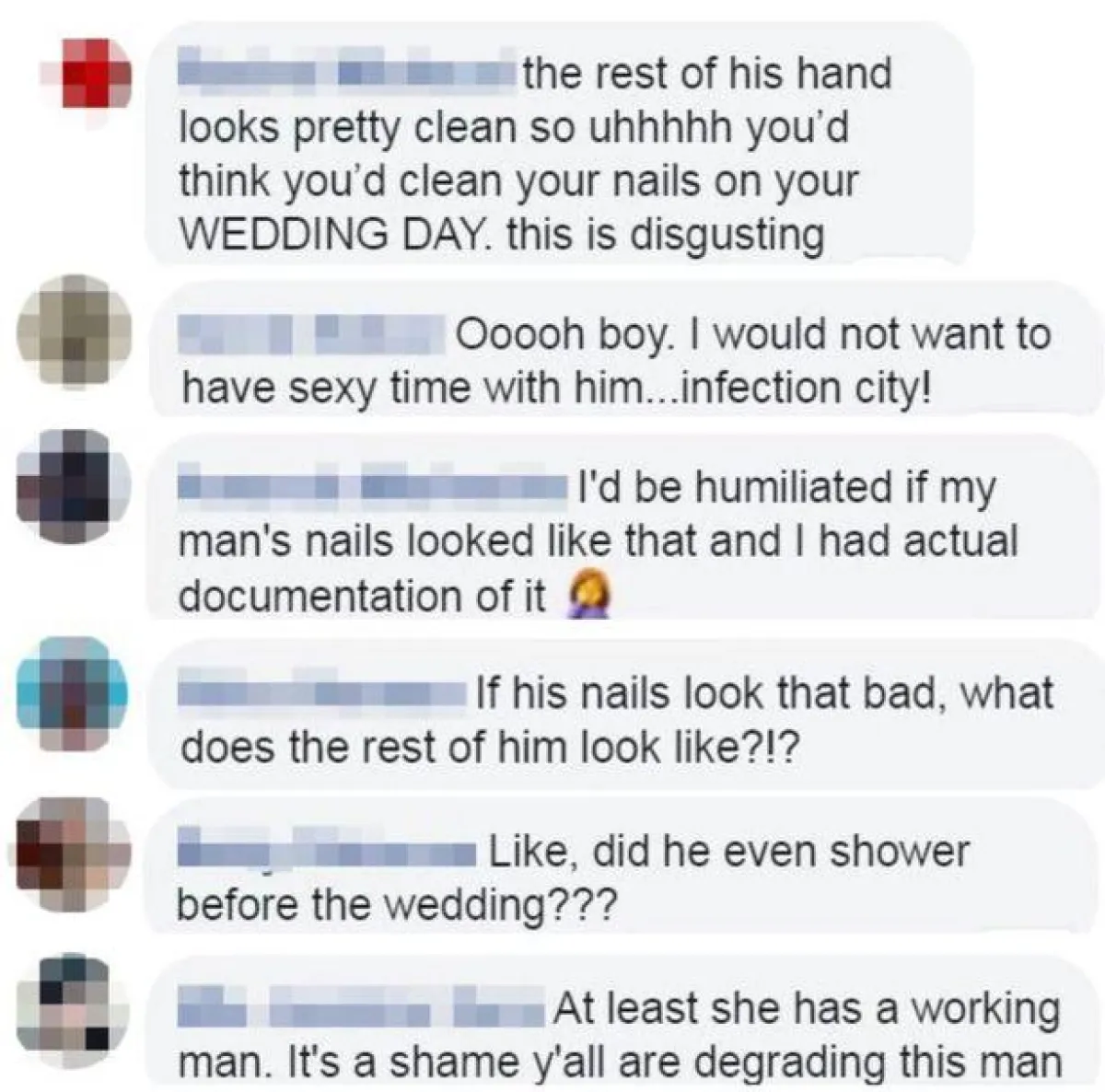 وجاءت التعليقات: «يمكنك على الأقل تنظيف ما تحت الأظافر للحصول على صورة زفاف».