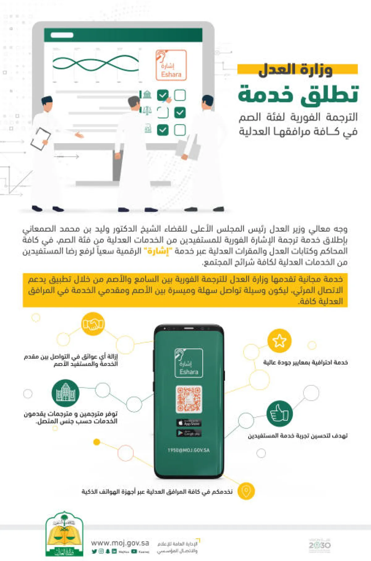 وأوضحت وزارة العدل أن أفراد فئة الصم يستطيعون الدخول إلى مرافقها العدلية كافة، واستخدام تطبيق «إشارة» المتوفر للتحميل عبر متاجر أجهزة الهواتف الذكية، والتحدث إلى مقدمي الخدمة بشكل سلس ومرن، مؤكدة أن الخدمة الجديدة ستزيل كل عوائق التواصل بين مقدمي الخدمات العدلية والمستفيدين من فئة الصم.