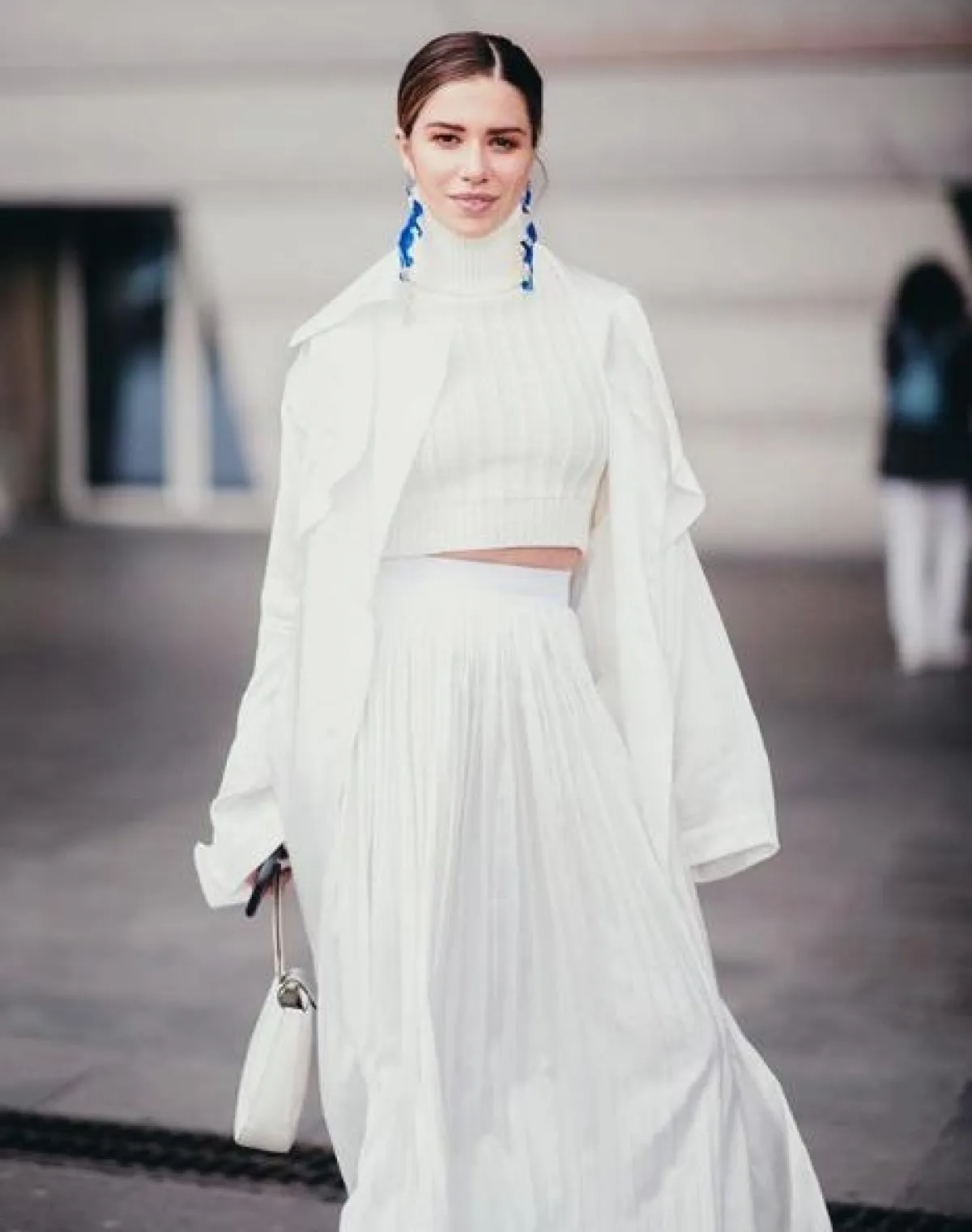 الاطلالات أحادية اللون إحدى أبرز صيحات الموضة هذا الموسم، وقد شاهدنا عددًا كبيرًا من النجمات والفاشينيستات وقد تبنّين هذه الموضة، ومنهنّ لارا اسكندر التي اختارت اللون الأبيض بشكل كامل لإحدى الاطلالات العصرية، وكانت عبارة عن تنورة ماكسي مع توب قصيرة بياقة عالية، ومن فوقهما معطف خفيف، وأكملت اللوك بشنطة يد من الجلد، وأقراط باللون النيلي أضافت من خلالهما لمسات حيوية لافتة.