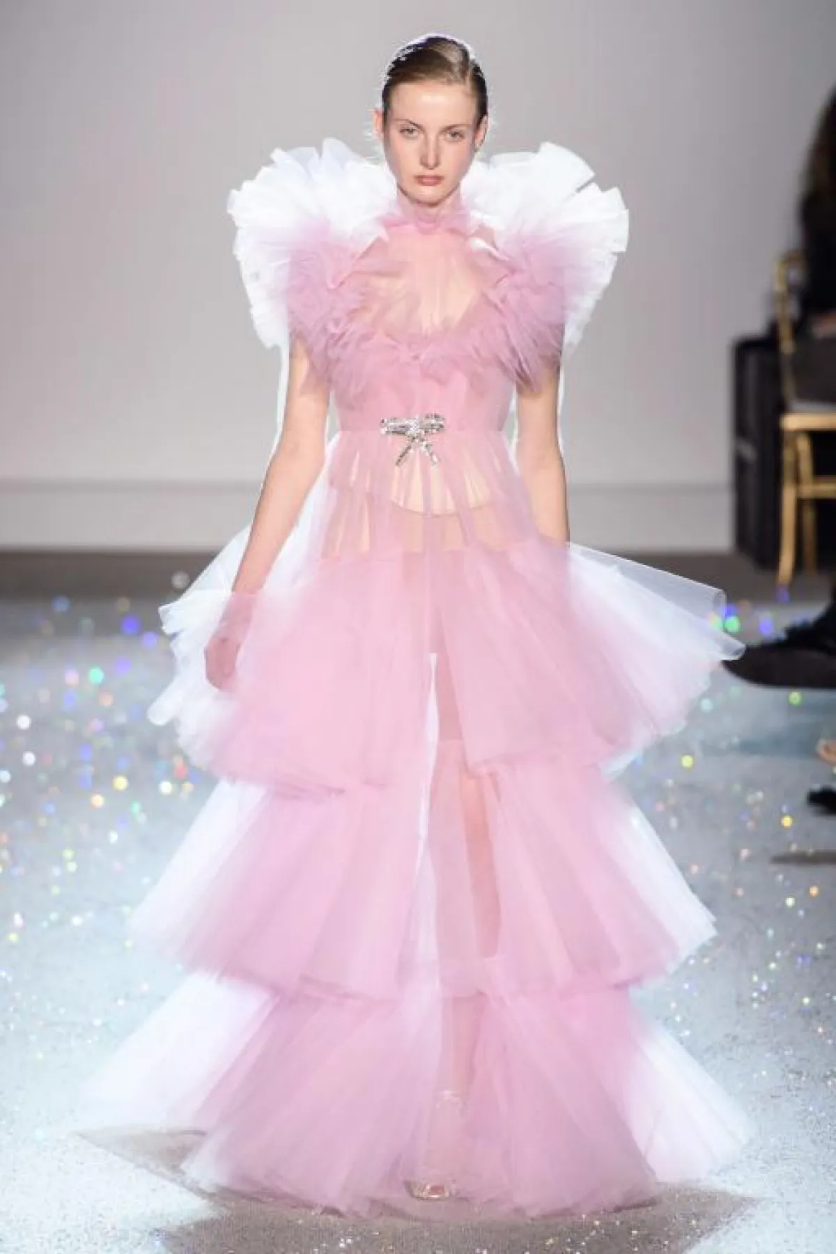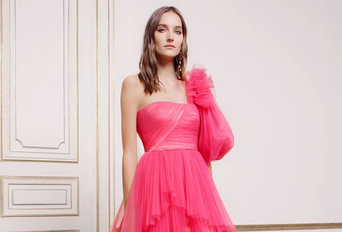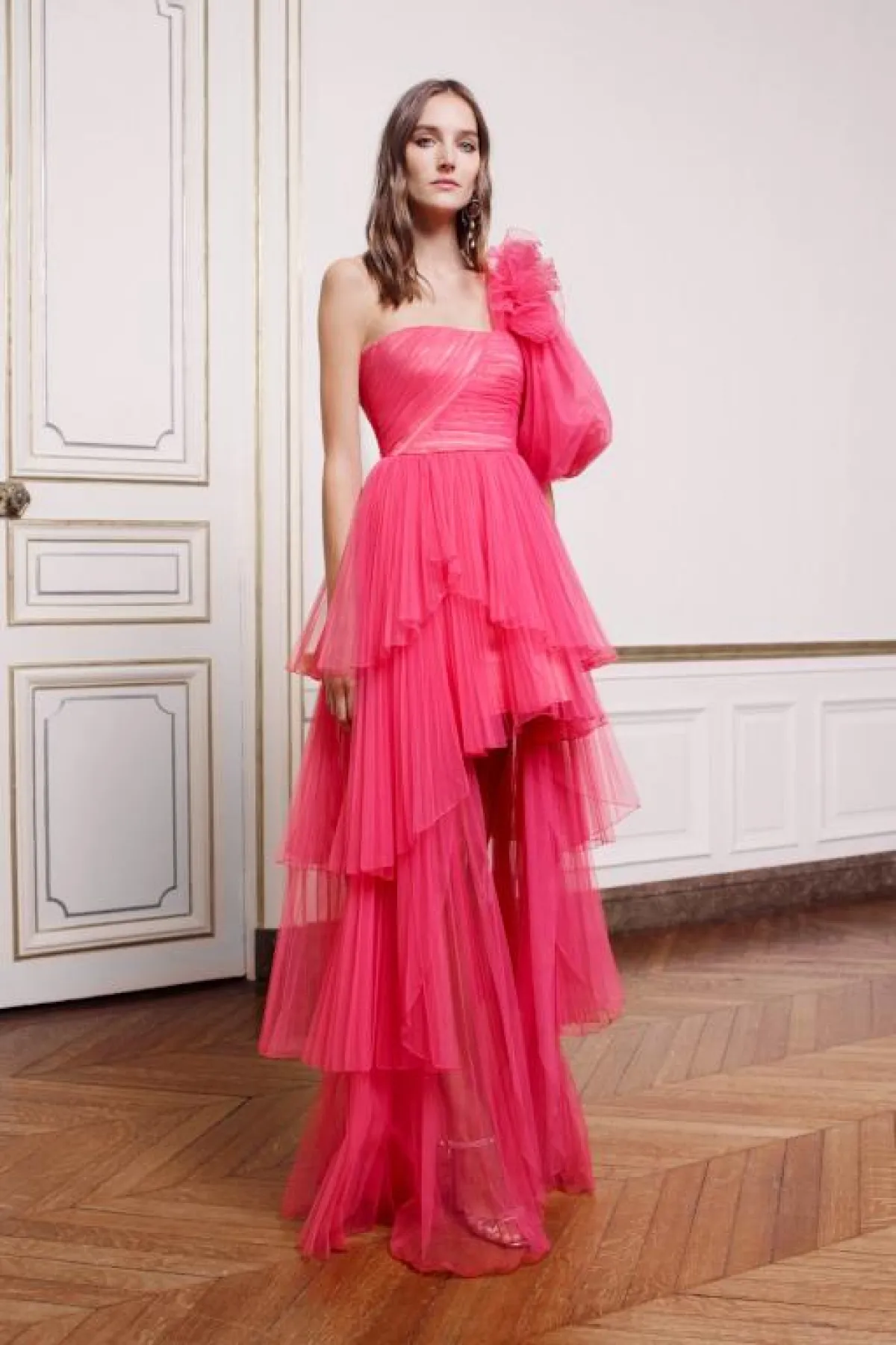 من التصميمات المميزة والكلاسيكية التي تناسب الصبيّة الناعمة، هو هذا الموديل من ألبيرتا فيريتي Alberta Ferretti Limited Edition، باللون الفوشي، مع خامة التول المنسدلة، والكشكشة الطبقية التي تزيدكِ طولًا ورشاقة، بالإضافة إلى الكشكشة على الكم الخاص بالفستان.