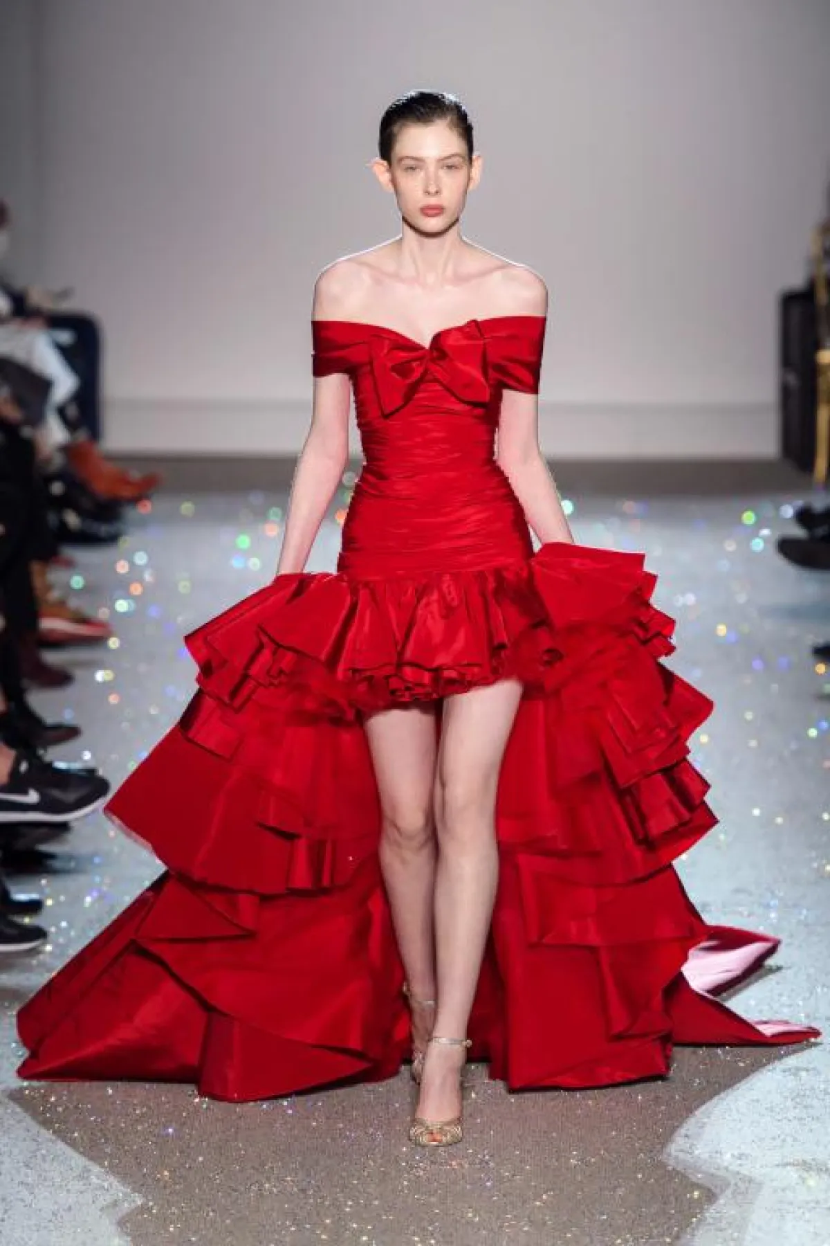 أما إذا كنتِ تفكرين في اعتماد فستان قصير، فما رأيكِ بتصميم مخملي مع لمسة من الكشكش من بعض الخصر، بالإضافة إلى اللمسة الفوضوية على الجزء العلوي، تمنحكِ اطلالة راقية وأنثوية، كالموديل من إيلي صعبElie Saab ، مع اللون الأحمر الجريء.