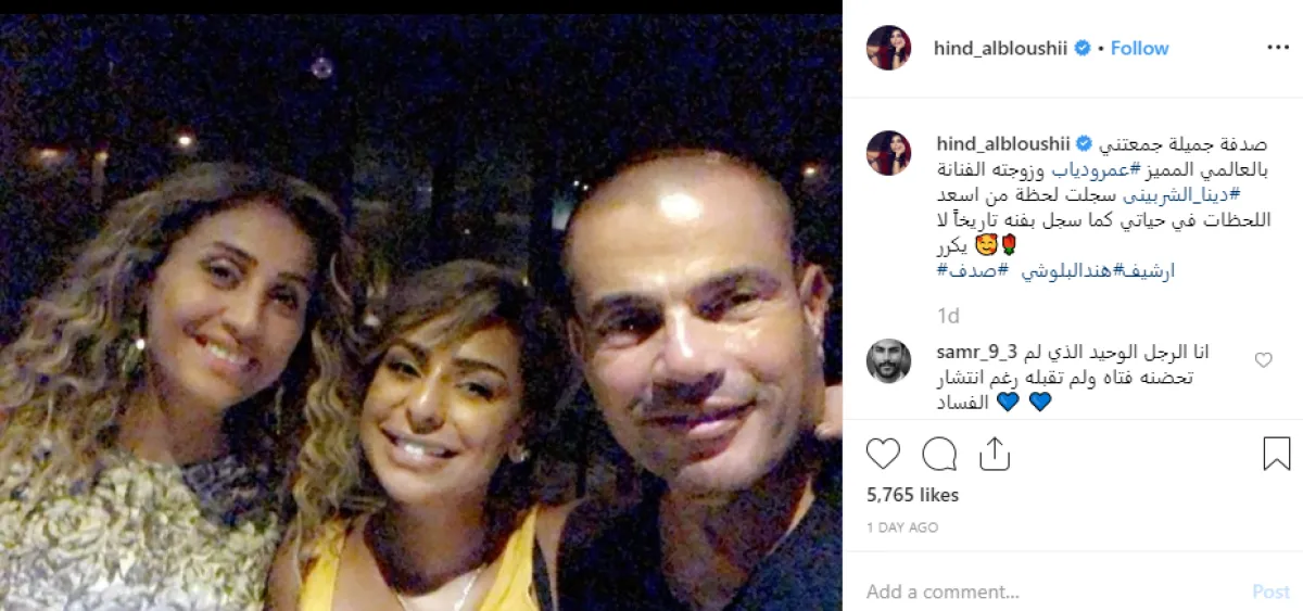 هند أكدت أن الصورة تم التقاطها بالصدفة أثناء تواجدها في مصر، وقالت تعليقا عليها عبر حسابها الرسمي بموقع إنستقرام: صدفة جميلة جمعتني بالعالمي المميز عمرو دياب وزوجته الفنانة دينا الشربينى سجلت لحظة من اسعد اللحظات في حياتي كما سجل بفنه تاريخاً لا يكرر.