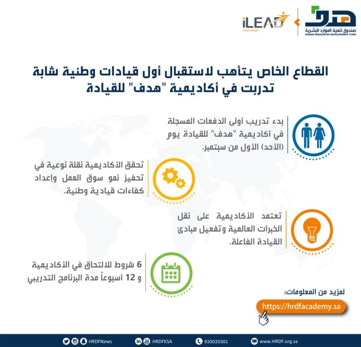 يتأهب القطاع الخاص لاستقبال أول قيادات وطنية شابة تدربت في أكاديمية «هدف» للقيادة، التابعة لصندوق تنمية الموارد البشرية. وأعلن «هدف» عن بدء تدريب أولى الدفعات المسجلة في الأكاديمية يوم الأحد المقبل الموافق، الأول من سبتمبر 2019،، وذلك بهدف تطوير مهارات قيادات المستقبل من منسوبي القطاع الخاص.