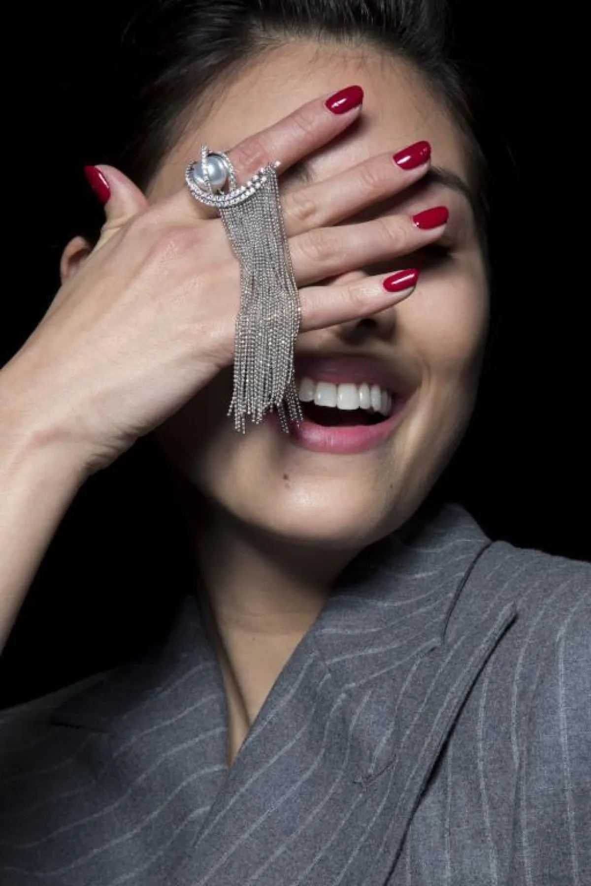 رأينا المناكير الأحمر الداكن في عرض أوسكار دي لارينتا على أظافر لامعة وأصابع زُيّنت بخواتم من الأحجار الكريمة لمزيد من الجرأة.