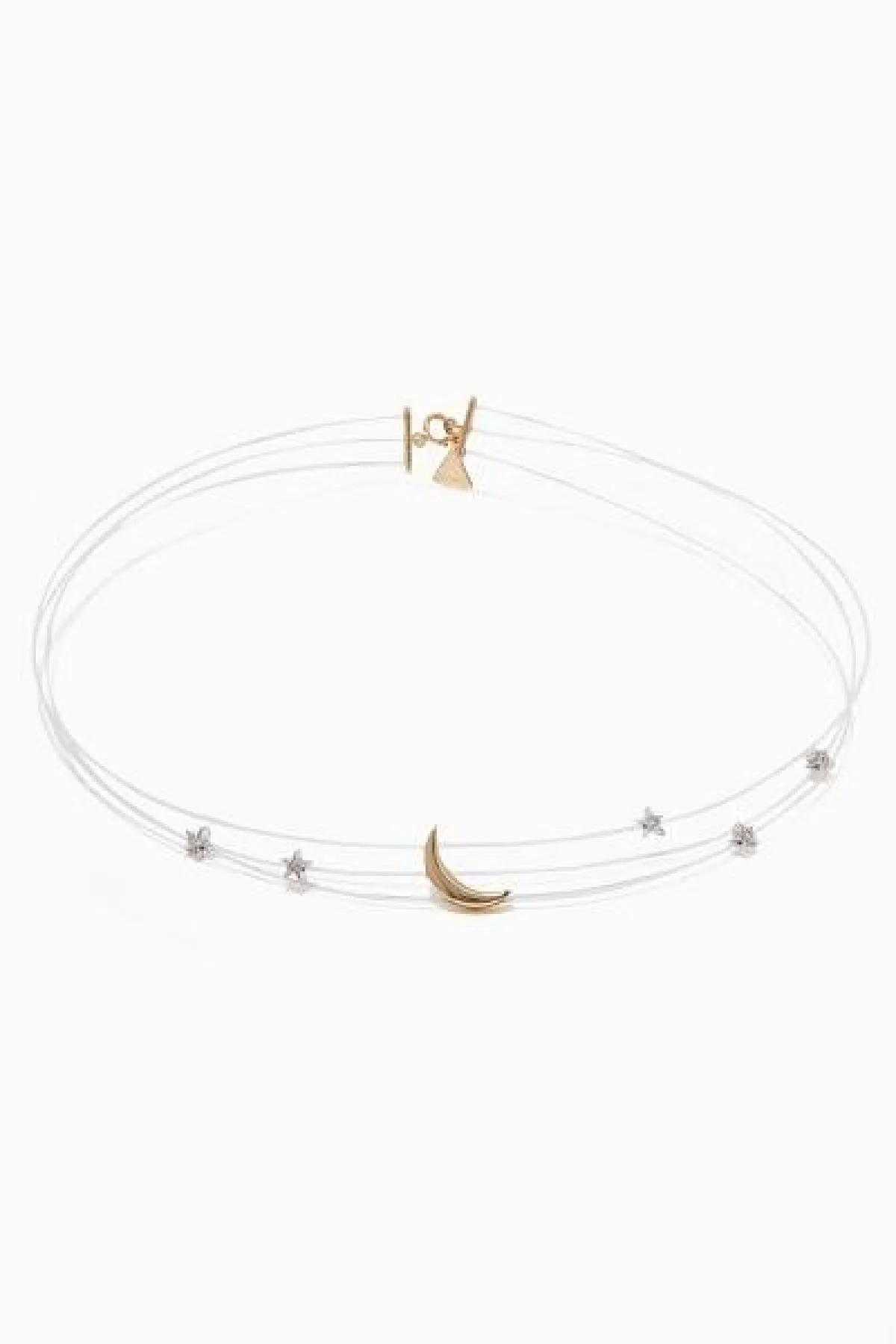 يعبر هذاالتشوكر Choker من علامة إم كيه إس MKS عن الأناقة البالغة، حيث يجسد الطابع الجمالي والرومانسي. صمم بحلي على شكل هلال من الذهب الأصفر، ومجموعة من النجوم المرصعة بألماس بالإضافة إلى حلقة شفافة لتبدو الحلي وكأنها طافية.