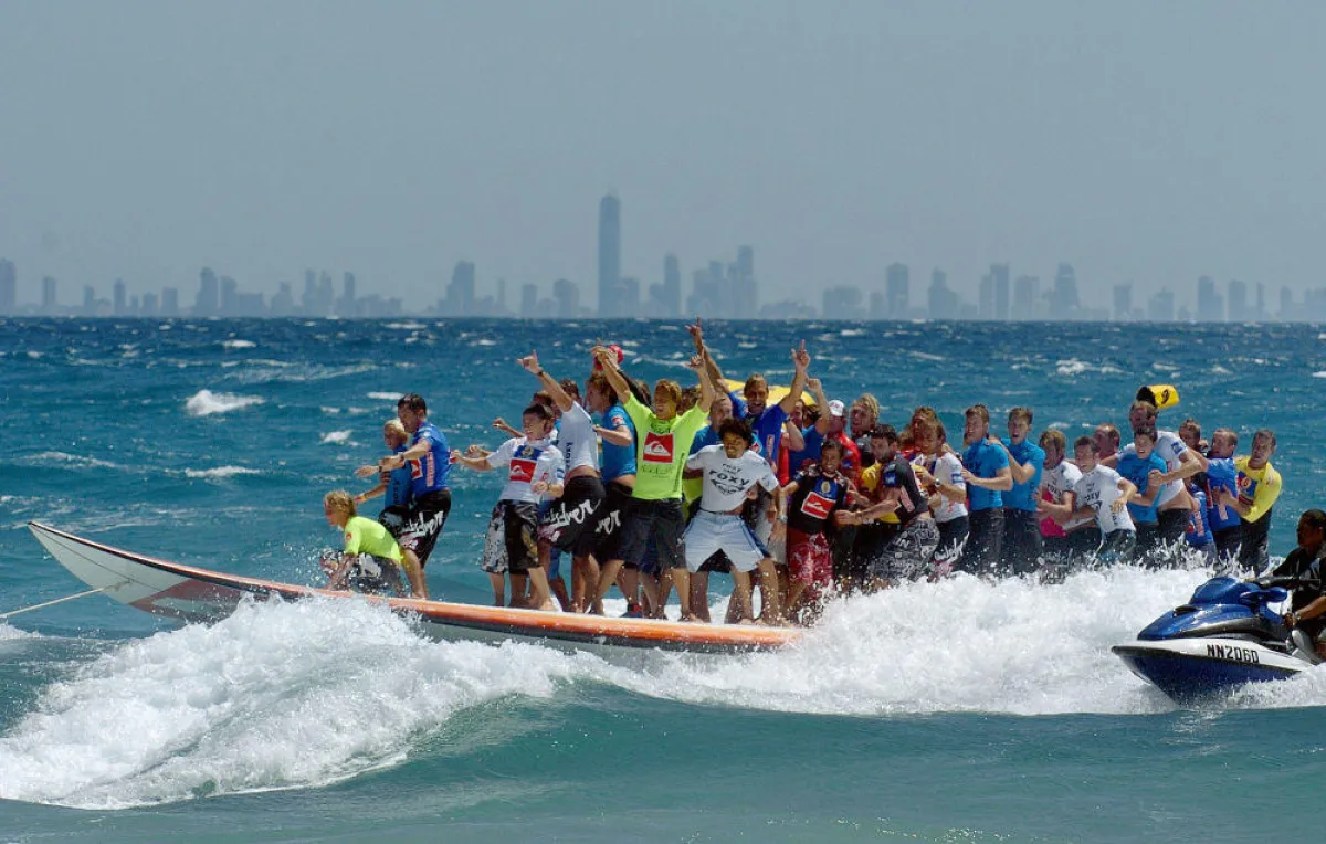 10- أطول لوح لركوب الأمواج في العالم، يركبه 47 شخصاً، ساحل غولد كوست في أستراليا، عام 2005.