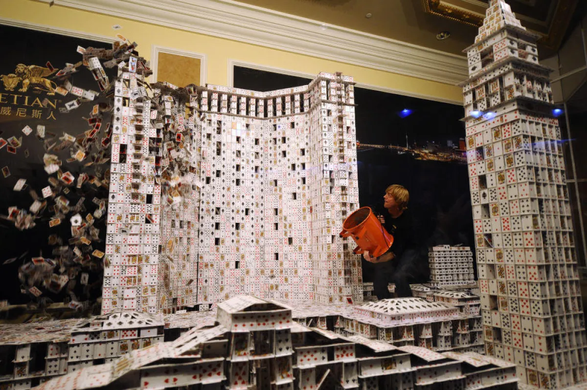15-بريان بيرغ يهدم مدينة صنعها من ورق اللعب (218،792 ورقة) لمبنى الكازينو والفندق في ماكاو، عام 2010.