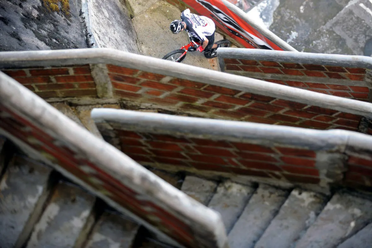 1-الكولومبي كزافييه زاباتا يركب الدراجة الهوائية على سلالم منطقة بيدرا ديل بينول في غواتاب، كولومبيا عام 2010.