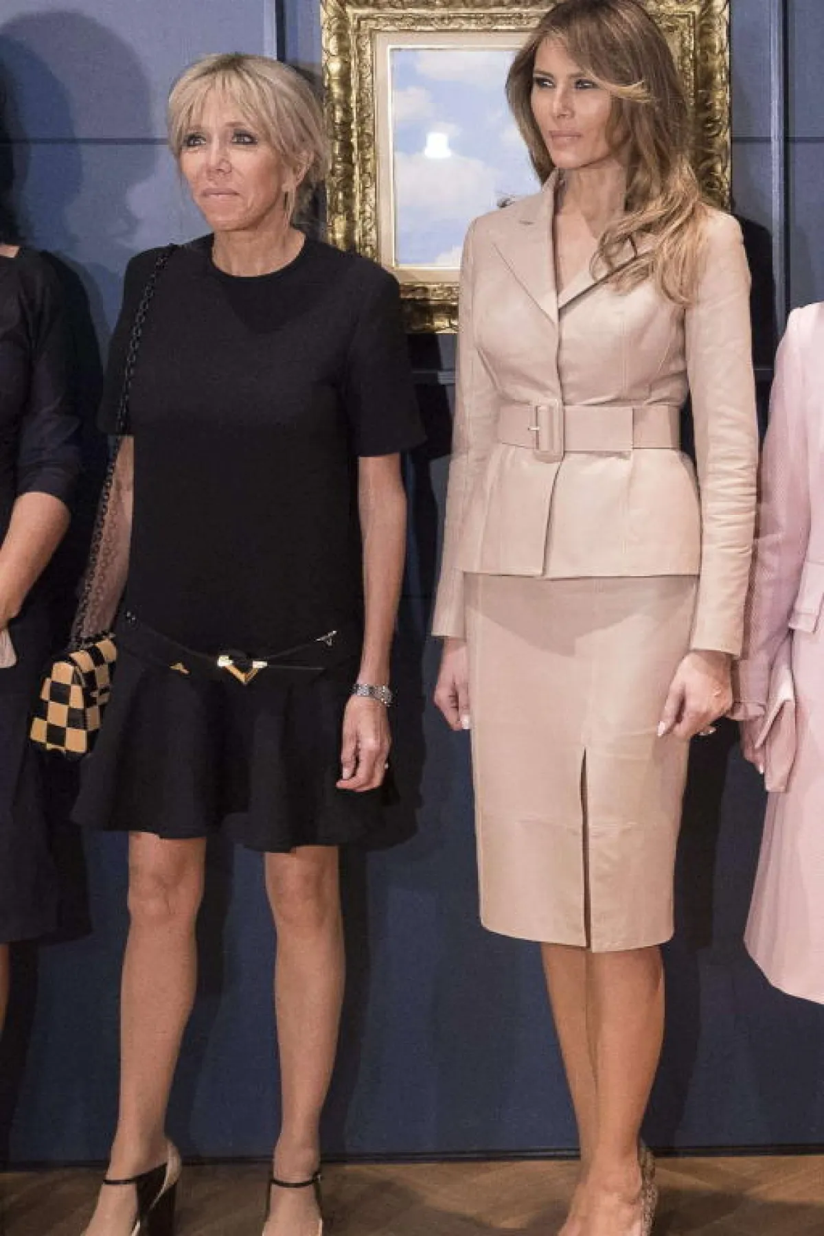 في مناسبة أُخرى أثناء المؤتمر، شاهدنا كلًّا من ميلانيا ترامب Melania Trump وبريجيت ماكرون Brigitte Macron في اطلالات ناعمة وأنيقة، حيث اعتمدت بريجيت فستان ميدي باللون البيج بتصميم بسيط وقصة مستقيمة، ونسقت معه حذاءً بكعب عالٍ باللون العسلي، بينما اختارت ميلانيا فستان بليسيه باللون الأبيض، مزينًا باكسسوار معدني على الخصر، ونسقت معه حذاءً بكعب عالٍ باللون الفضي.