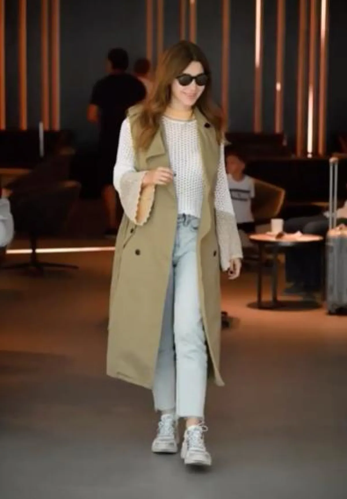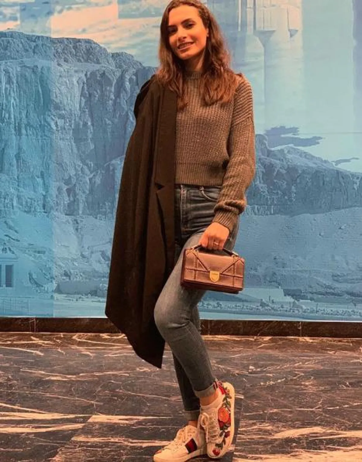 الجينز من القطع المفضلة بالنسبة للفتيات الجامعيات، حيث إنه مريح وعملي كما يسهل تنسيقه، وكارمن سليمان بدورها كانت قد نسقت لوك مميزًا مثاليًّا للجامعة، اختارت فيه بنطلون جينز بقصة كلاسيكية مع سويتر باللون الرمادي الداكن، ومعطفًا أسود كلاسيكيًّا، وأكملت الاطلالة بشنطة يد من ديور Dior وحذاء رياضي معرق برسومات الورود من غوتشي Gucci.