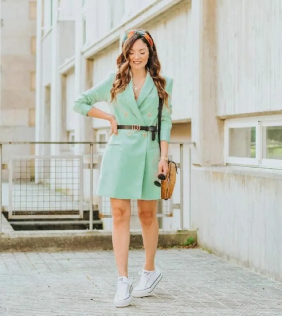 -لاشك أن الفستان البليزر من أحدث صيحات الموضة وقد تظنين أنه لا يتناسب مع الحقيبة القش إلا أنه سيكون مميزا للغاية معها.