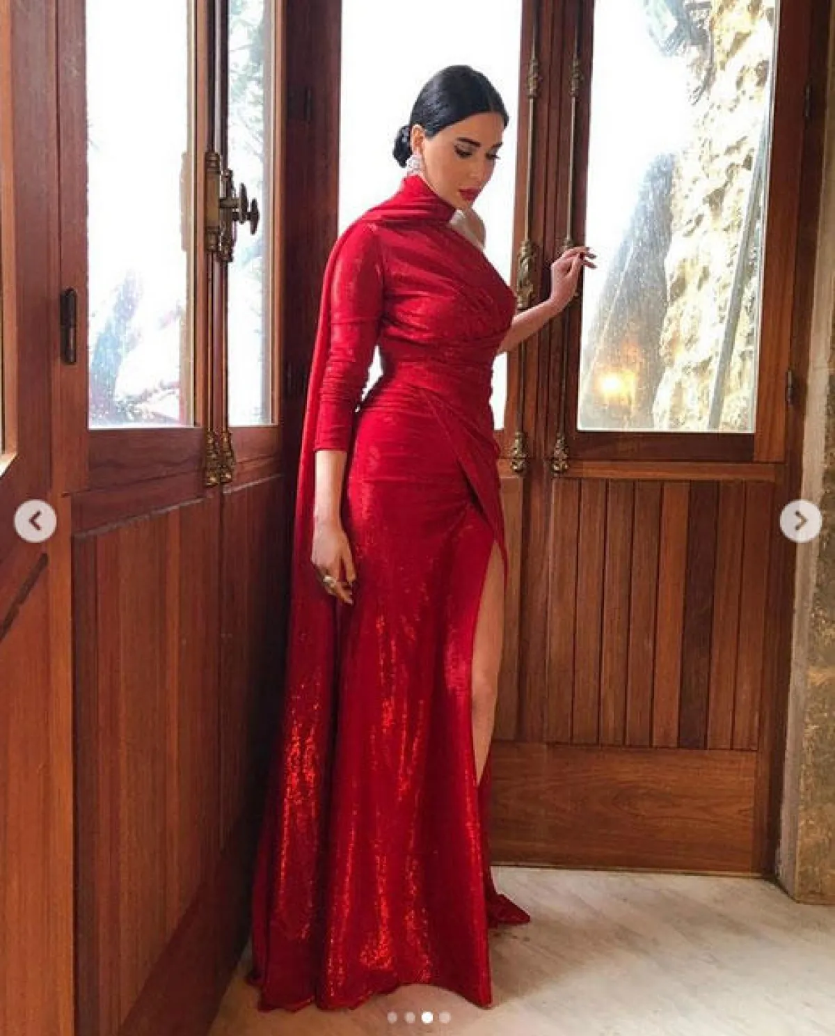 وفي إطلالة أخرى ارتدت فستان أحمر بقماش شفاف مع لمسات التطريزات البرّاقة وشق جانبي طويل، وبحزام يبرز خصرها النحيل.