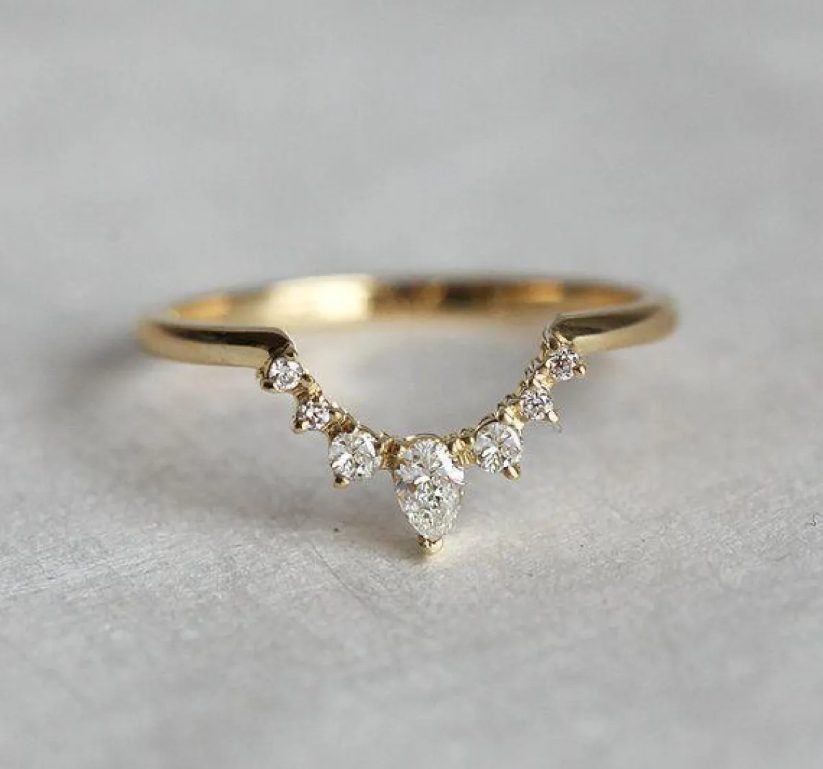 من الممكن أن تعتمدي دبل خطوبة ذات شكل غير تقليدي، كالبدلة ذات المنحنى الصغير، بحيث تكسر الشكل الدائري للدبلة، كما أنّ هذا التصميم يجعل يديكِ تبدوان أكثر نحافة وطولًا، مع الأحجار الماسية الصغيرة.