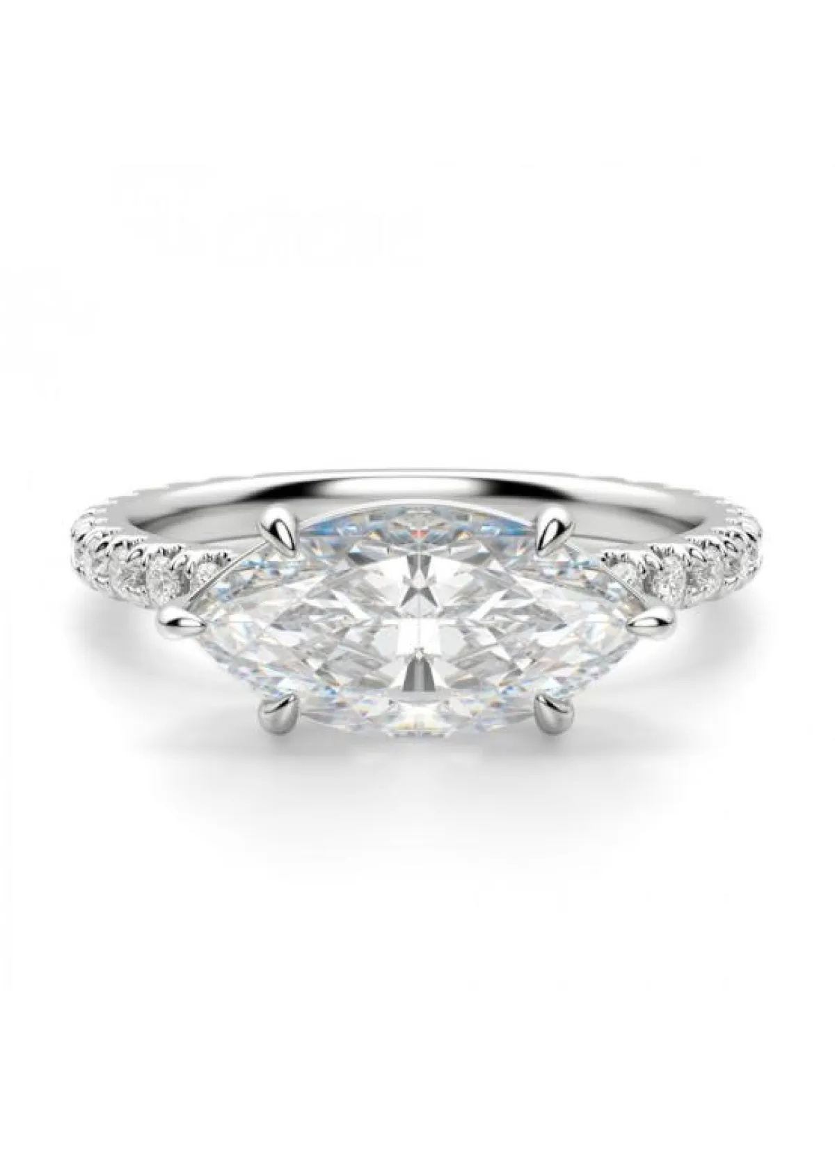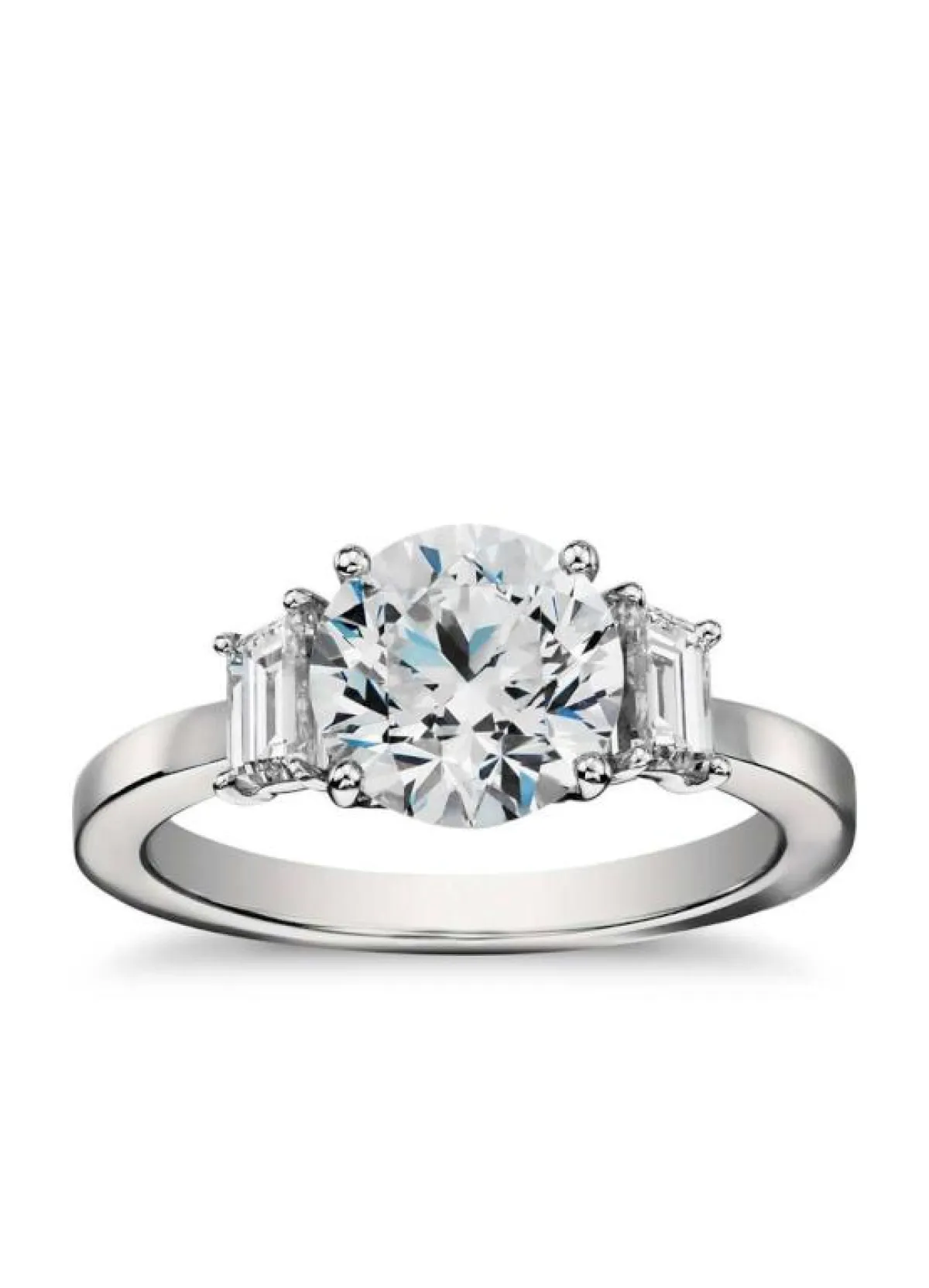 يمكنكِ اختيار خاتم بسيط يتوسطه حجر سميك شفاف وفخم، ولكن اختاريه بأشكال هندسية مميزة، ولافتة للأنظار، كهذا الشكل البيضوي للخاتم، مع أحجار مستطيلة صغيرة الحجم على كلا الجانبين.