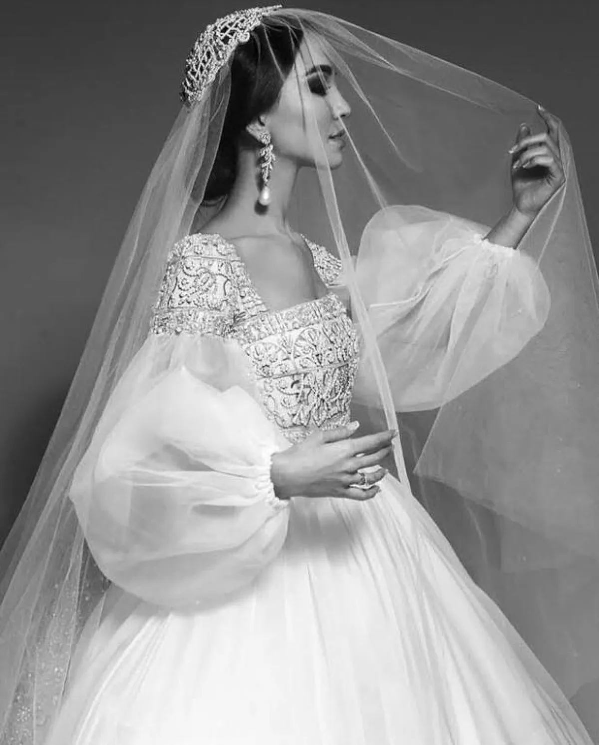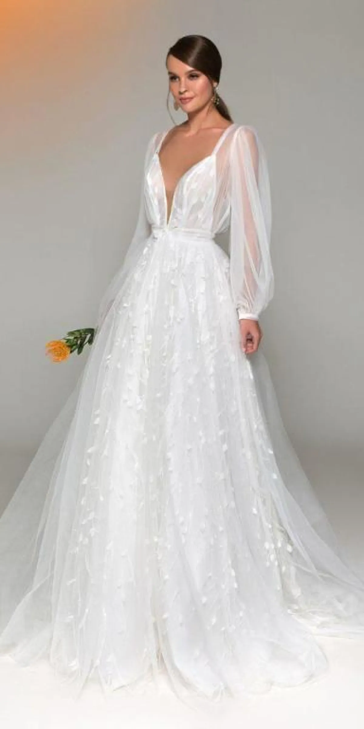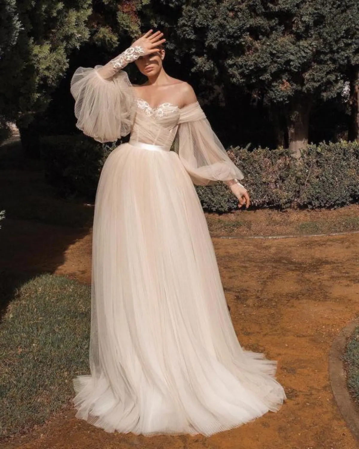 التول من الخامات التي برزت هذا الموسم بشكل كبير، وسيكون مناسبًا إن أردتِ اعتماد أكمام واسعة، بأن تختاري الفستان بالكامل من التول المنفوش، مع تطريزات بسيطة كالورود، ضيقًا من الخصر، حتى يتماشى مع الكم الواسع، ولا تبدي فوضوية أو بوزن زائد.