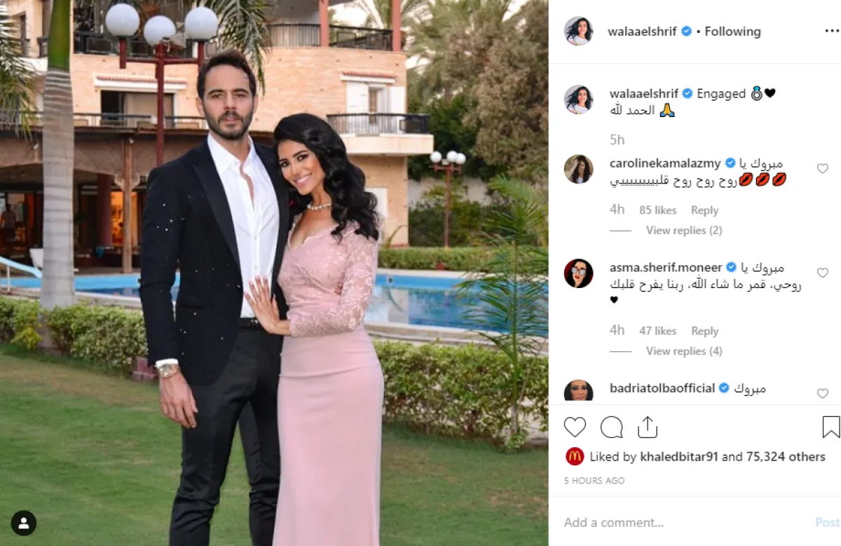 الفنانة المصرية الشابة ولاء الشريف كشفت عن خطوبتها فجر اليوم السبت بنشر صورة مع العريس الممثل الشاب ماجد الشرقاوي، وعلقت عليها عبر حسابها بموقع إنستقرام قائلة: اتخطبت، وانهالت التعليقات فقالت أسماء شريف منير: مبروك يا روحي، قمر ما شاء الله، ربنا يفرح قلبك.
