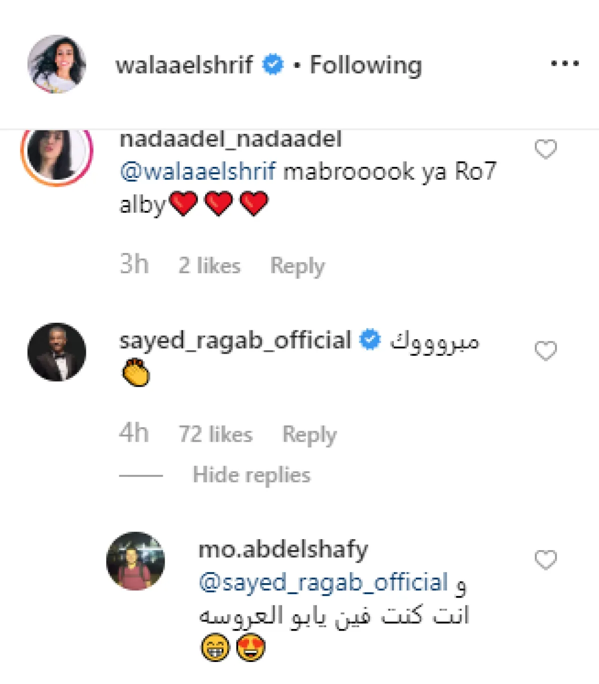 وأضافت الفنانة الشابة كارولين عزمي التي قدمت دور شقيقتها في مسلسل "أبو العروسة": مبروك يا روح روح روح قلبييييييييي، وتوالت التعليقات من النجمات نجلاء بدر ودنيا عبد العزيز وآيتن عامر وإيمان سلامة وندى عادل ووفاء قمر، وحظى تعليق الفنان سيد رجب الذي جسد شخصية والدها في المسلسل على إعجاب عدد كبير من متابعيها رغم أنه لم يكتب إلا كلمة "مبروك"، وعلق أحدهم عليه قائلا: و انت كنت فين يابو العروسه؟