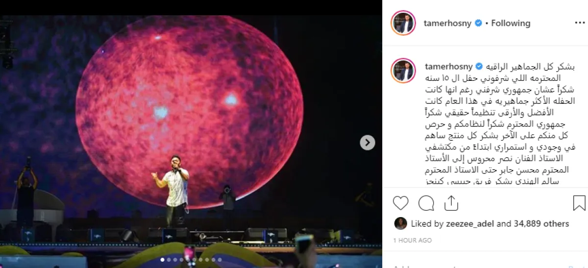 وأضاف: بشكر فريق چيبسي كينجز الأسطوري على مشاركتي عزف أغنية بنت الإيه شكرًا أستاذ تامر وجيه شركة إيچيبت كلندر على التنظيم الراقي والرائع شكرًا جميع رجال الأمن شكرًا لكل عباقرة المسرح أحمد عصام عاصم السيد شهير وليد الحريري تامر فوزي مايسه نصر وفرقتي الموسيقية الغالية اساتذة الموسيقى العربية شكرًا لكل ضيوفي الكرام شركاء مشواري الفني شكرًا أستاذ سالم الهندي وشركة روتانا على تكريمكم لي وبالتأكيد تشرفت كل الشرف بالتعاقد معكم مره أخرى أنتم شركة محترمة بالفعل.